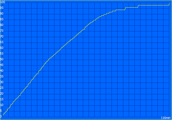 Ein vollständiger Ladevorgang dauert bei eingeschaltetem Gerät knapp zwei Stunden; 50 % stehen aber schon nach 32 Minuten wieder zur Verfügung.