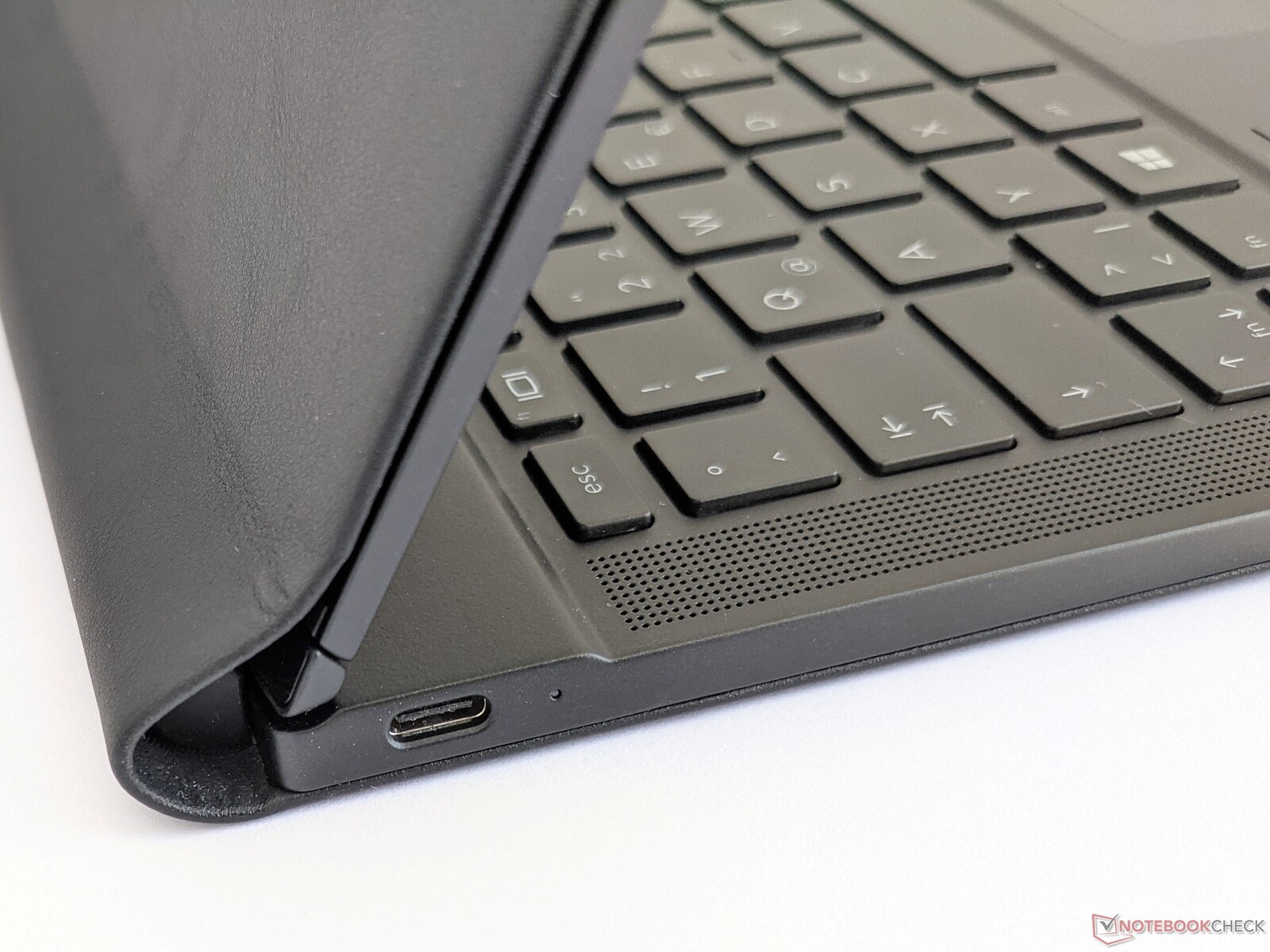 Die Ausstattung des HP EliteBook Folio 13.5 fällt sehr sparsam aus. Bis auf die zwei USB-C-Anschlüsse und den Headsetport sind keine weiteren Verbindungsmöglichkeiten vorhanden. Einer der beiden USB-Ports wird zudem durch das Netzteil blockiert, wenn dieses angeschlossen ist.