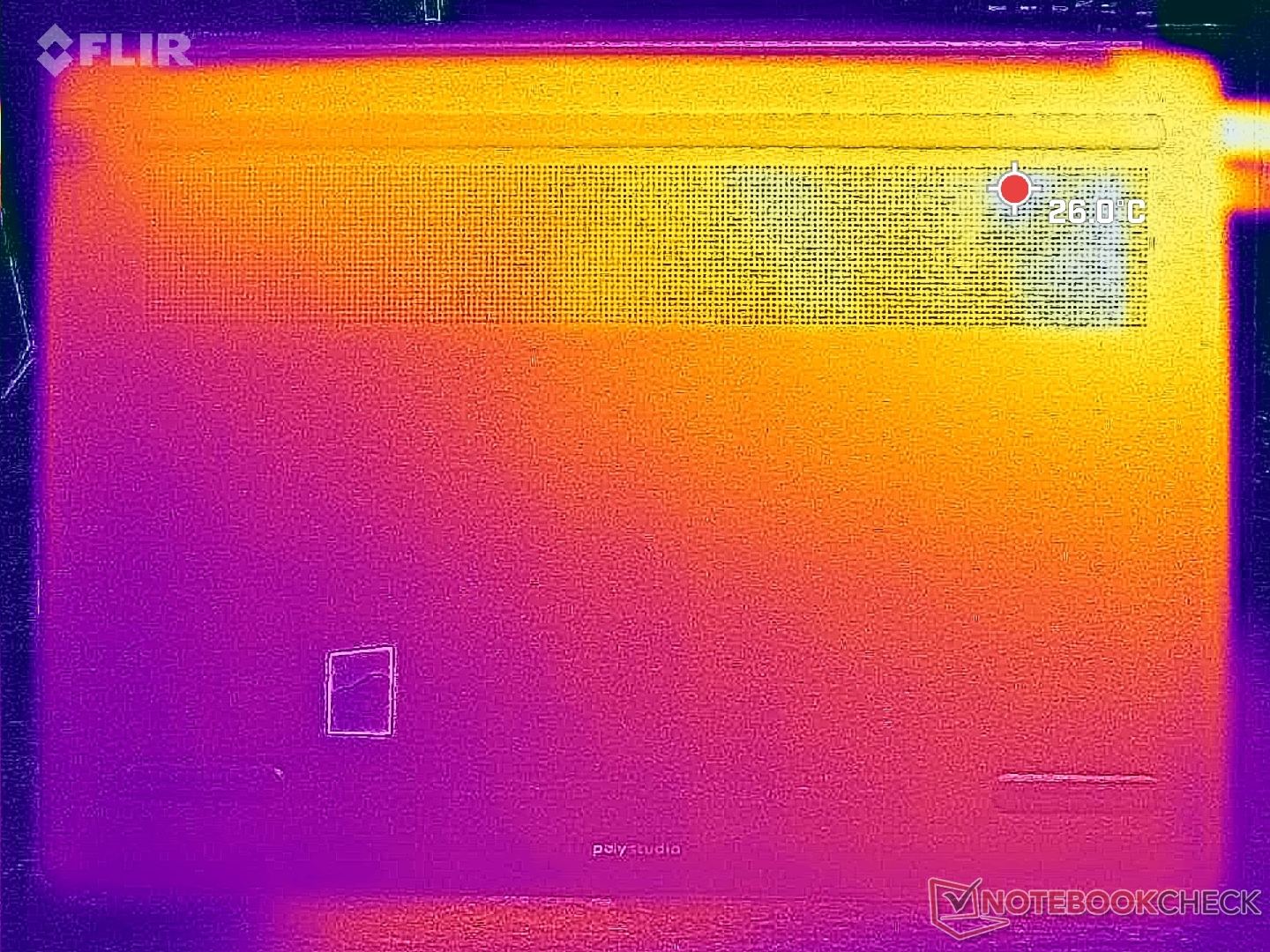 Die linke Systemseite ist durch das asymmetrische Kühlsystem immer wärmer als die rechte. Der Hot Spot nahe der WASD-Tasten kann sich unter starkem Stress auf über 40 °C erhitzen, während die rechte Tastaturhälfte beinahe 10 °C kühler bleibt. Die Temperaturunterschiede zwischen beiden Gehäusehälften sind spürbar, aber nie so, dass es unbequem wird.