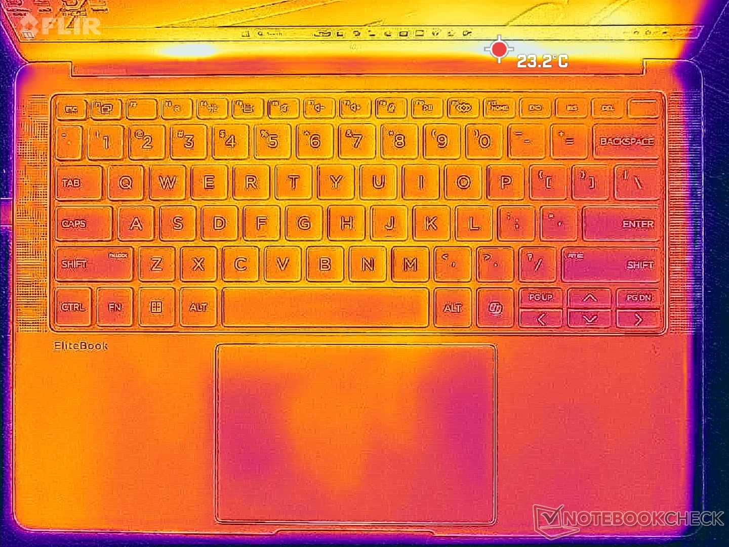 Die Oberflächentemperaturen sind in der Mitte am wärmsten, wo Hotspots bei anspruchsvoller Belastung bis zu 36 °C erreichen können. Das ist spürbar kühler als bei dem bisherigen EliteBook 1040 G10 unter ähnlichen Bedingungen trotz der großen Leistungsunterschiede um fast 10 °C.