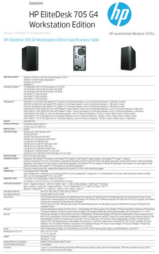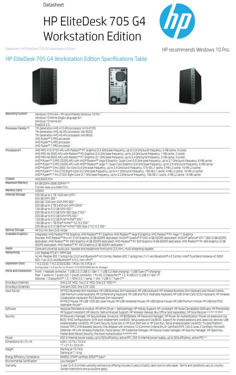 Für den US-Markt nennt HP bei der EliteDesk 705 G4 Workstation Edition als mögliche Prozessoren unterschiedliche Konfigurationen, die bei der 7. Generation von AMDs Pro A-Series APUs als stärksten Prozessor den AMD Pro A10-9700 mit integrierter Radeon R7 Graphics (bis 3,8 GHz, 2 MB Cache, 65 W, 4 Cores) vorsieht. Bei den AMD Ryzen-SKUs beginnt HP mit dem AMD Ryzen 3 Pro 2200G mit AMD Radeon Vega 8 Graphics (bis 3,7 GHz) und als Topmodell den AMD Ryzen 7 Pro 2700x mit bis zu 4,1 GHz und 8 Cores. Im letzteren Fall ist dann auch eine optionale dedizierte Grafiklösung notwendig.