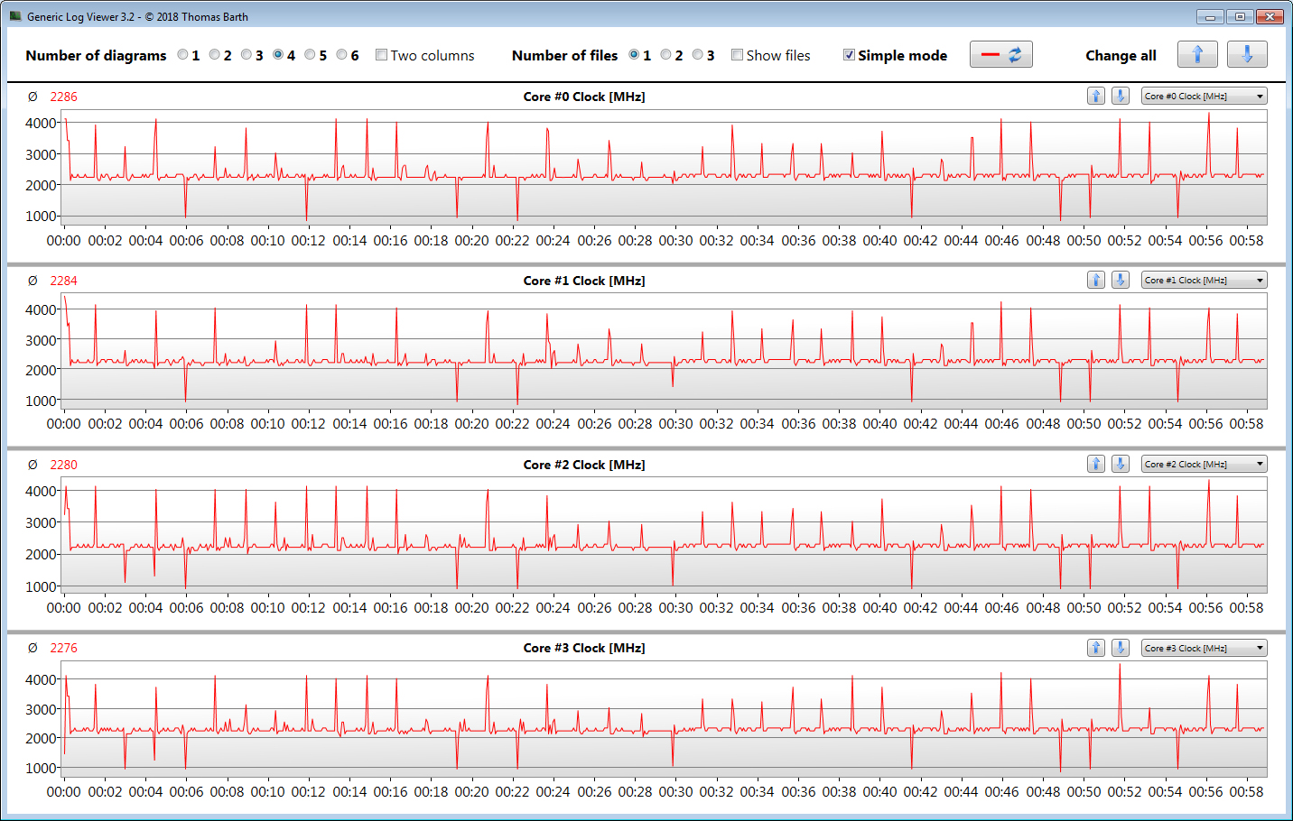 Die Multi-Thread-Tests der Cinebench-Benchmarks werden kurzzeitig mit 3,8 bis 4,6 GHz durchlaufen. Dann pendelt sich der Takt bei 3,9 bis 4 GHz ein. Die Single-Thread-Tests werden mit 2 bis 4,6 GHz bearbeitet. Im Akkubetrieb liegen die Geschwindigkeiten bei 1,9 bis 2,3 GHz (Multi-Thread) bzw. 1,5 bis 1,9 GHz (Single-Thread).