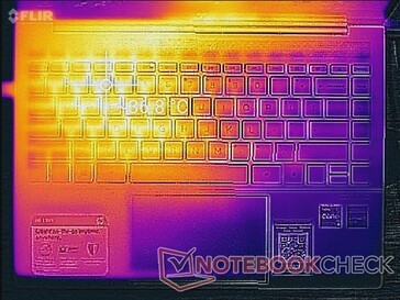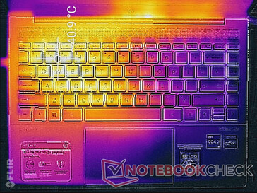 Die Oberflächentemperatur ist aufgrund der Positionierung der beiden Prozessoren auf der linken Seite des Geräts wärmer. Interessanterweise ist das Kühlsystem des Envy 14 asymmetrisch, während es beim Envy 15 symmetrisch ist. Das führt zu unterschiedlichen Temperaturprofilen auf der Oberfläche. Eine symmetrischere Aufteilung ist zu bevorzugen, da dadurch die häufig eingesetzten WASD-Tasten so kühl wie möglich gehalten werden können und auch die Handballenablage unter hoher Last auf beiden Seiten eine ähnliche Temperatur hat. Nutzer sollten beim Gamen mit einer leicht verschwitzten linken Hand rechnen.