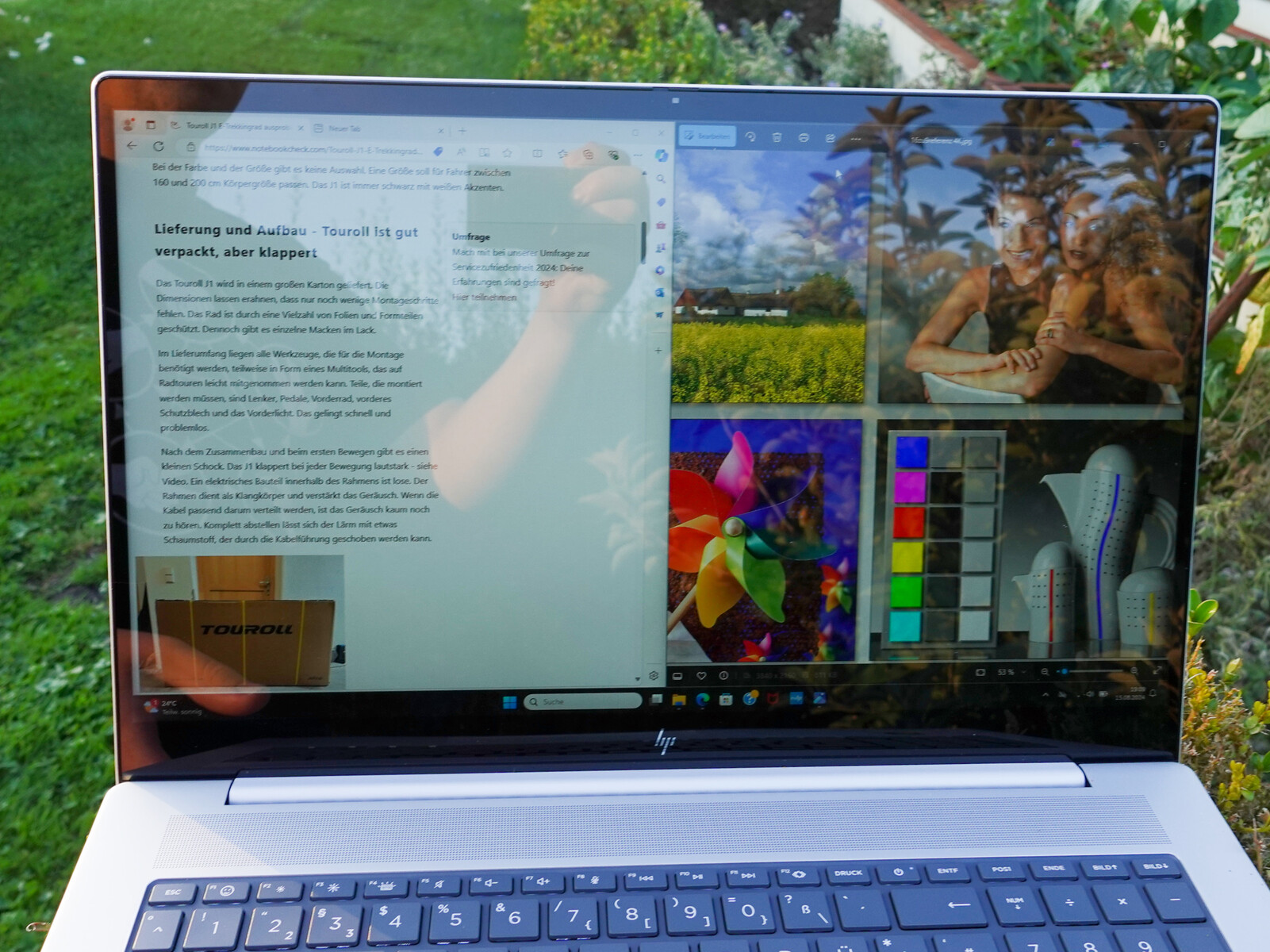 Rund 300 cd/m² sind für einen Bildschirm mit spiegelnder Oberfläche nicht besonders hell. Bereits im Studiolicht fällt auf, dass hier Reflexionen die Ablesbarkeit deutlich stören können. Auch im Außeneinsatz zeigt sich selbst in der Abendsonne, dass die Kombination aus Glasoberfläche und geringer Helligkeit nicht unbedingt förderlich ist.