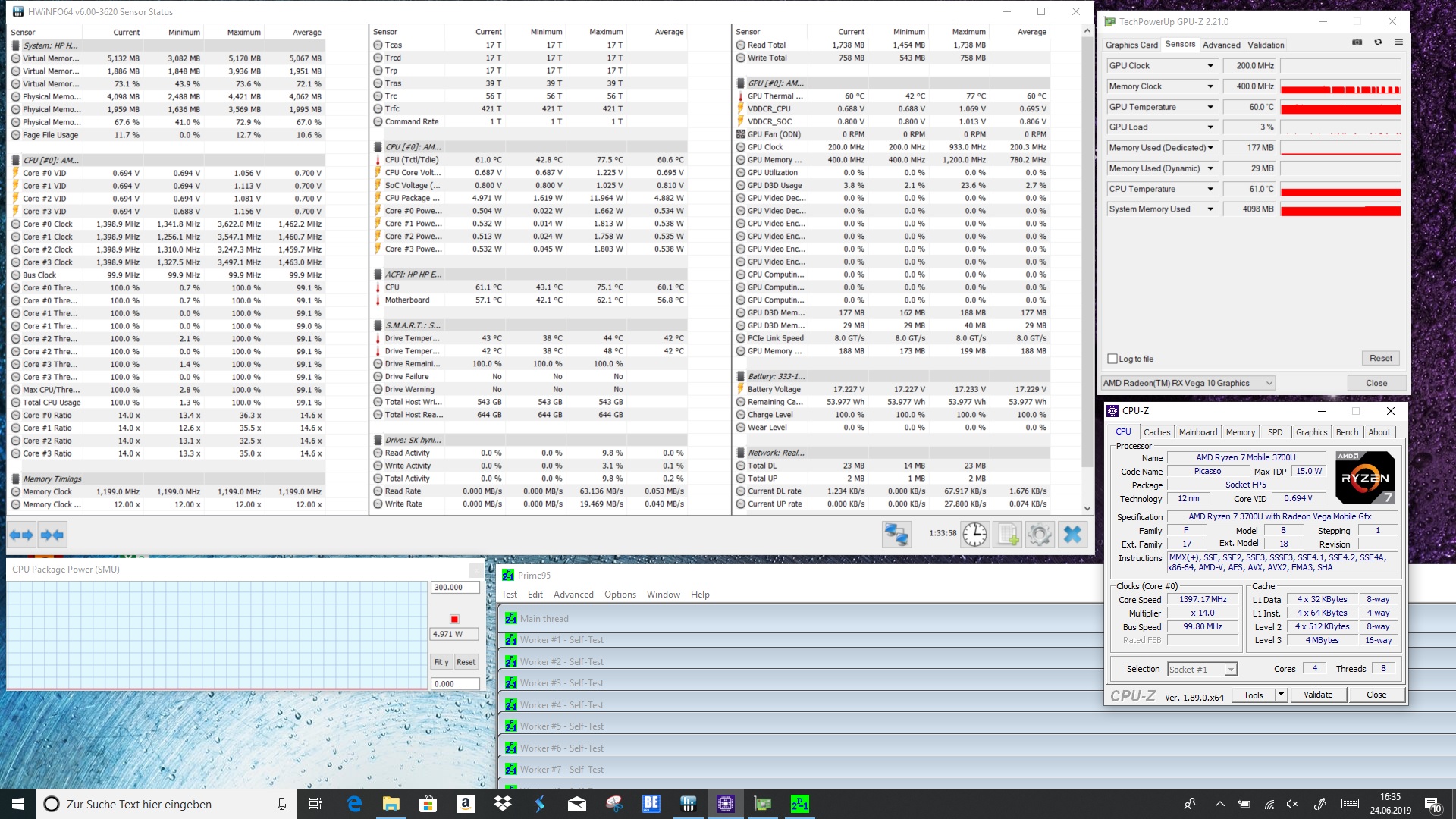 Wird zudem auch noch die AMD Radeon RX Vega 10 belastet, sinkt die Taktfrequenz noch weiter ab, denn die geringe TDP müssen sich beide Komponenten teilen. Die Temperaturen sind aber auch hier etwa auf dem gleichen Niveau wie zuvor beim Prime 95 Test. Nur der GPU-Teil ist mir 60 °C etwas kühler.