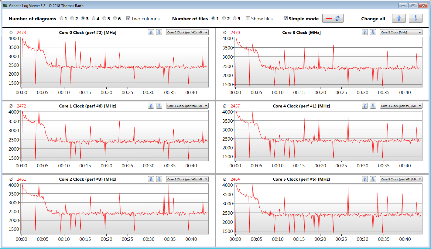 Der Rechner federt kurze Lastspitzen mit hohen Taktraten ab. Die höchsten Geschwindigkeiten werden bei aktivem Thermo-Profil "Leistung" erreicht. Bei längerer Last sinkt die CPU-Geschwindigkeit - ein überraschendes Verhalten, das bei allen Thermo-Profilen auftritt. Alle bisher getesteten Ryzen-5-4500U-Geräte erreichen während des Schleifendurchlaufs dauerhaft deutlich höhere Taktraten.