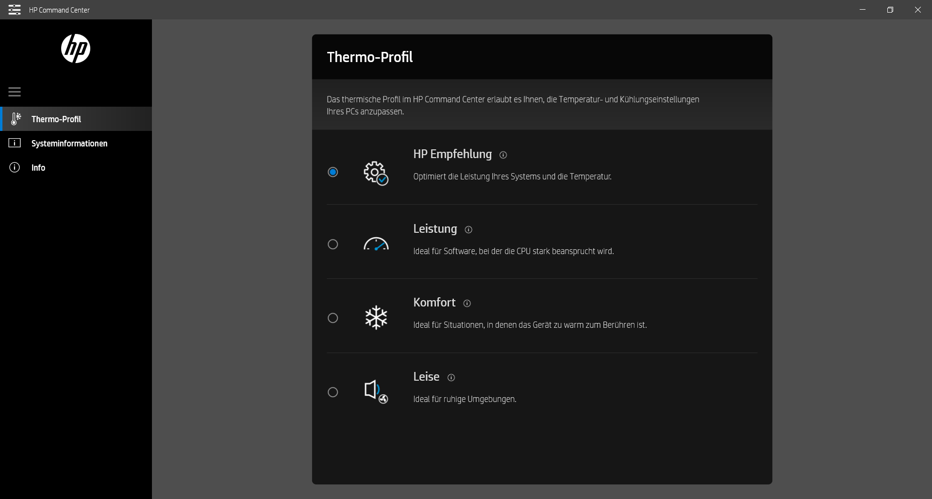 Das vorinstallierte HP Command Center ermöglicht die Wahl eines Thermo-Profils. Wir haben unseren Test bei aktivem Profil "HP Empfehlung" durchgeführt.