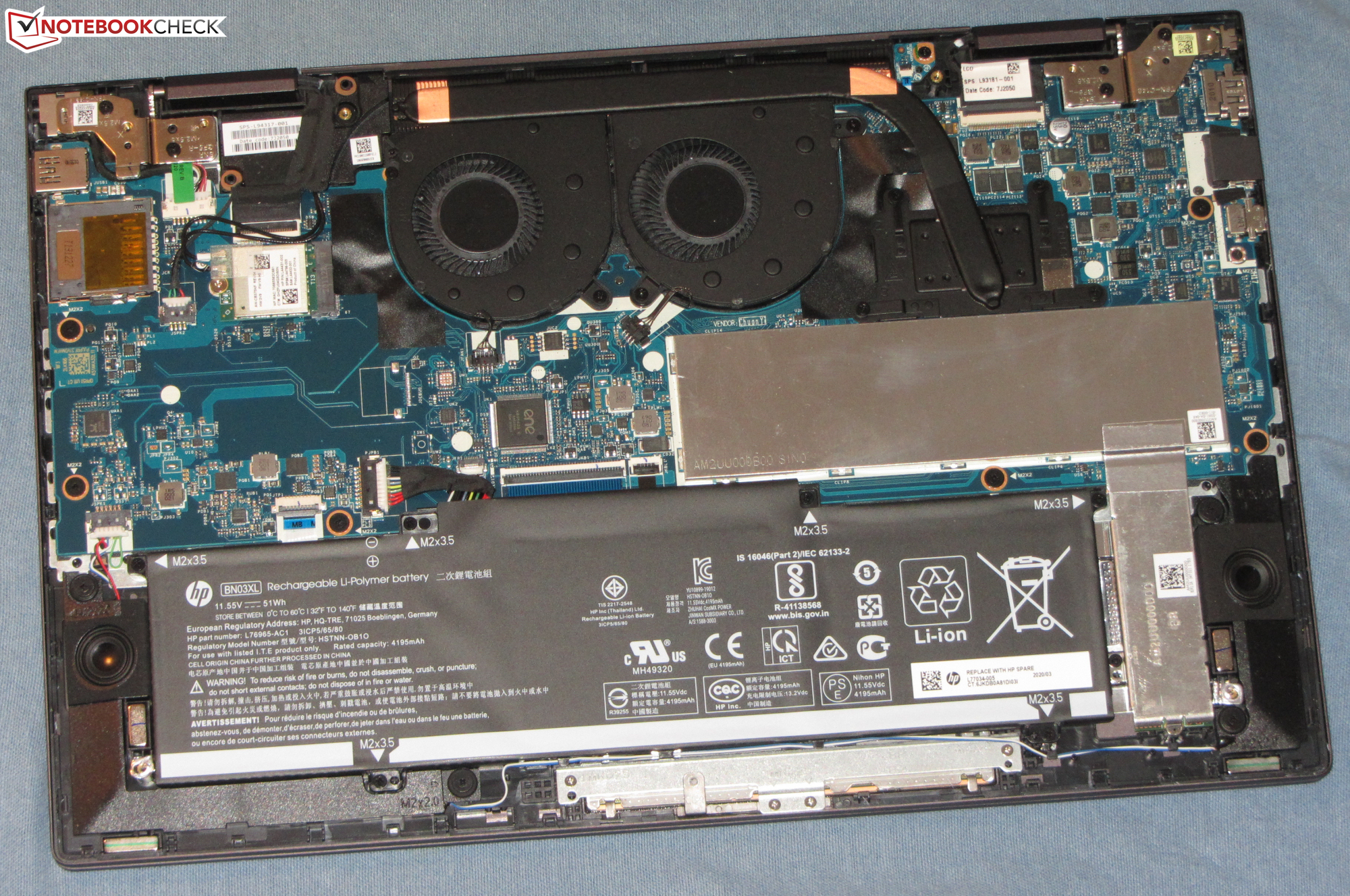 Die Spaltmaße des schicken, mattschwarzen Metallgehäuses stimmen, es sind keine Materialüberstände aufzuspüren. Die Baseunit dürfte etwas steifer ausfallen. Der Akku ist fest verbaut. An die Innereien gelangt man nach der Demontage der Unterschale. Diesen Vorgang hat HP nicht sehr benutzerfreundlich gestaltet.