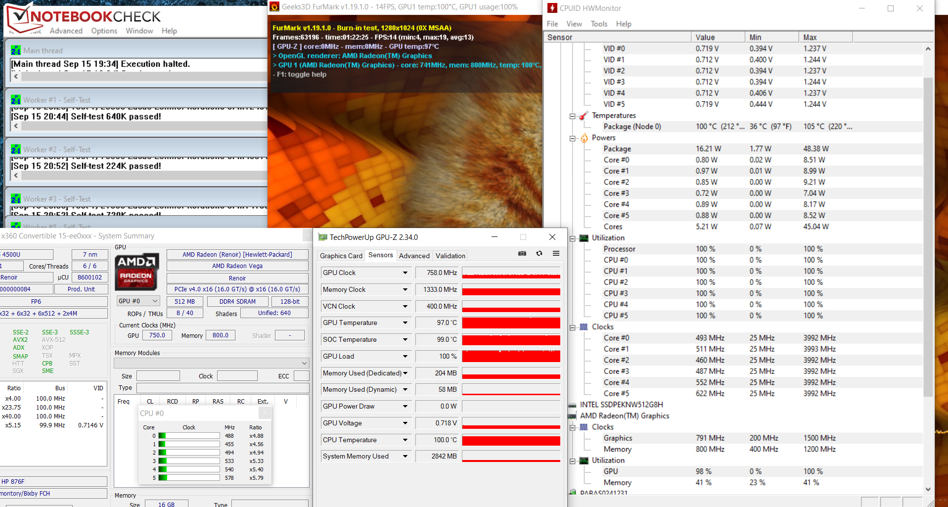 Der große Schwachpunkt stellt die mangelhafte Leistungsausnutzung der Ryzen 5 4500U APU dar. Kurz andauernden Lastspitzen (Single- und Multi-Thread) begegnet sie mit viel Rechenleistung. Dauerhafte Multi-Thread-CPU-Last wird mit deutlich reduzierten Taktraten quittiert. Das Gleiche gilt für die GPU. Darüber hinaus brechen die Bildwiederholraten innerhalb von Spielen immer wieder ein.