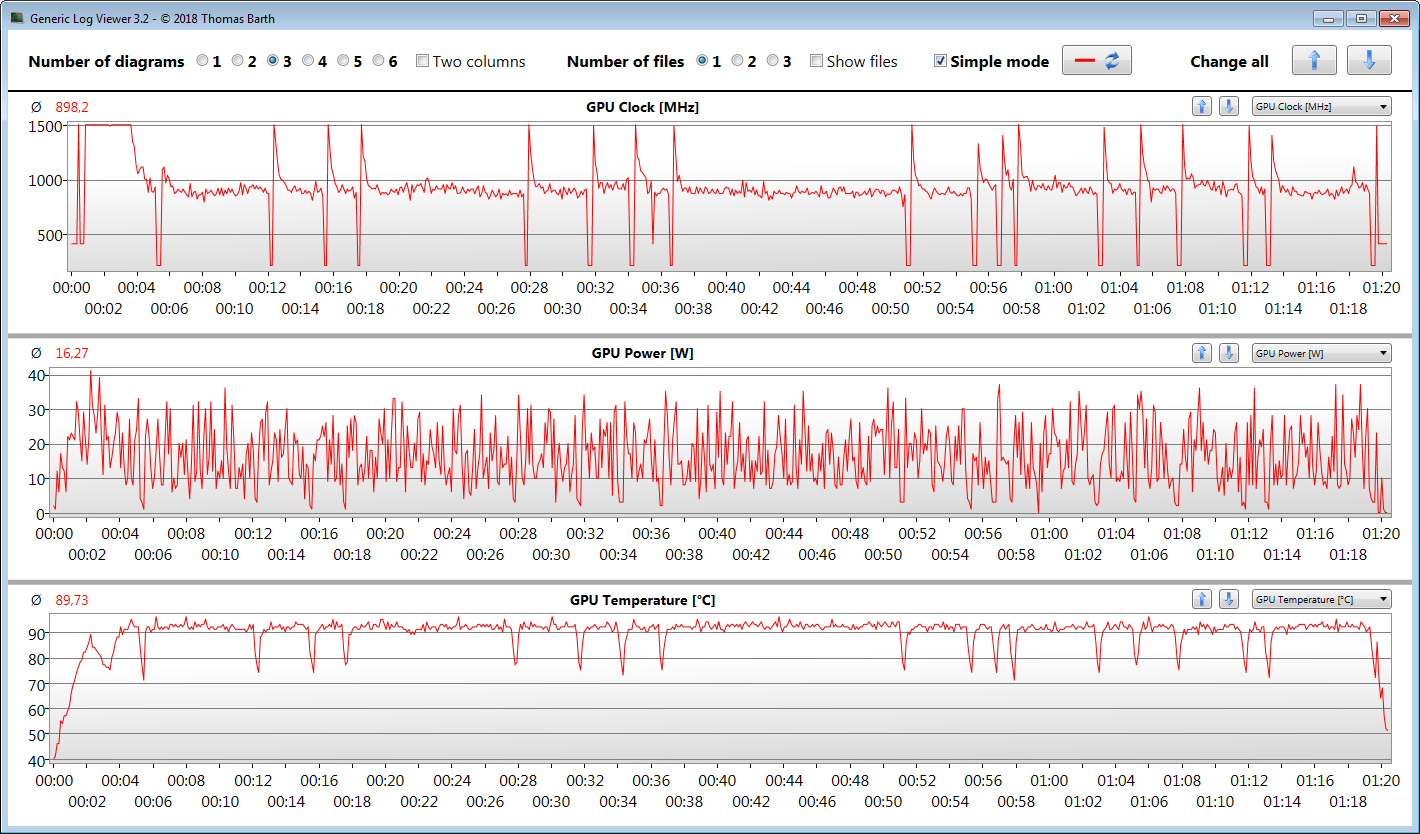 Allerdings zeigt unser Witcher-3-Test (das Spiel läuft für etwa 1 h mit FHD-Auflösung und max. Qualitätseinstellungen; die Spielfigur wird nicht bewegt), dass die GPU nach wenigen Minuten von Höchstgeschwindigkeit (1.500 MHz) auf ca. 800 bis 950 MHz abgebremst wird. Im weiteren Verlauf brechen die Geschwindigkeit und somit die Bildwiederholrate immer wieder kurz ein. Ein ungetrübter Spielspass ist hier nicht gegeben.
