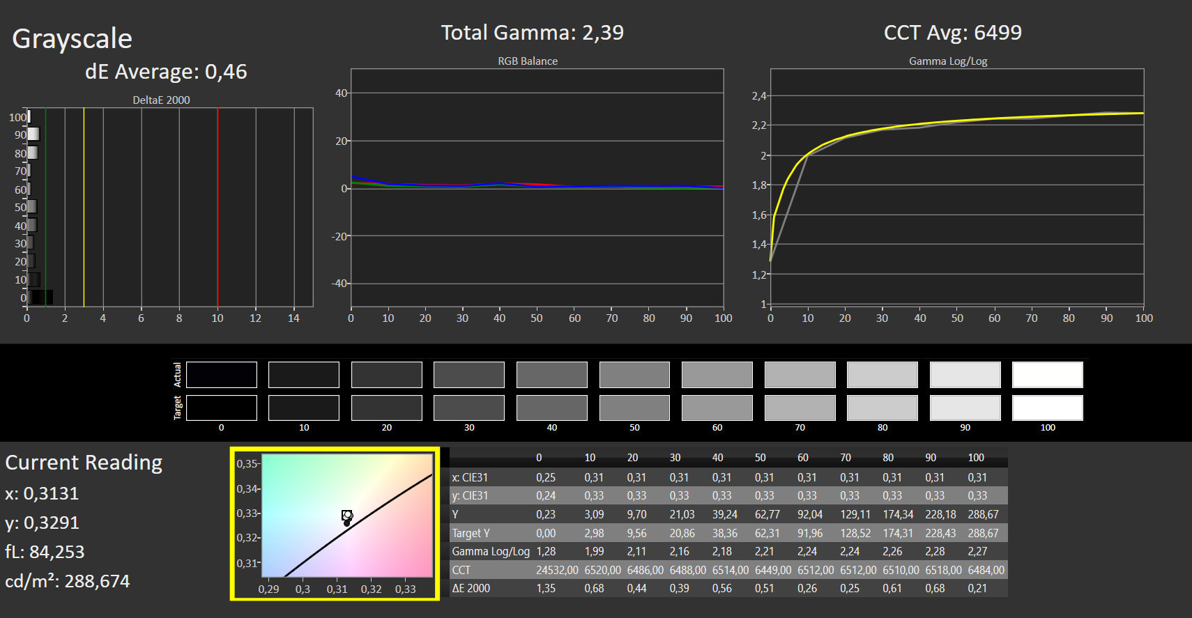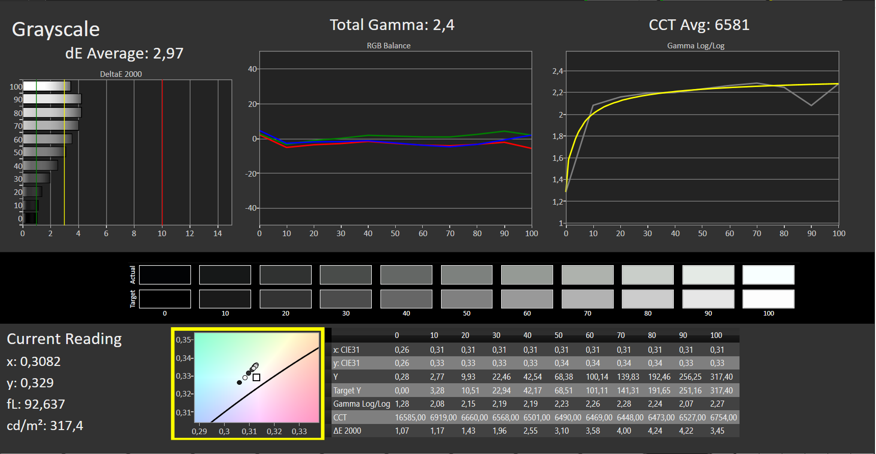 ΔE Greyscale Calman: 2.97 | ∀{0.09-98 Ø5}