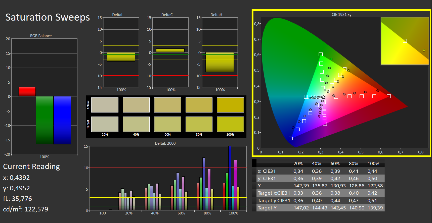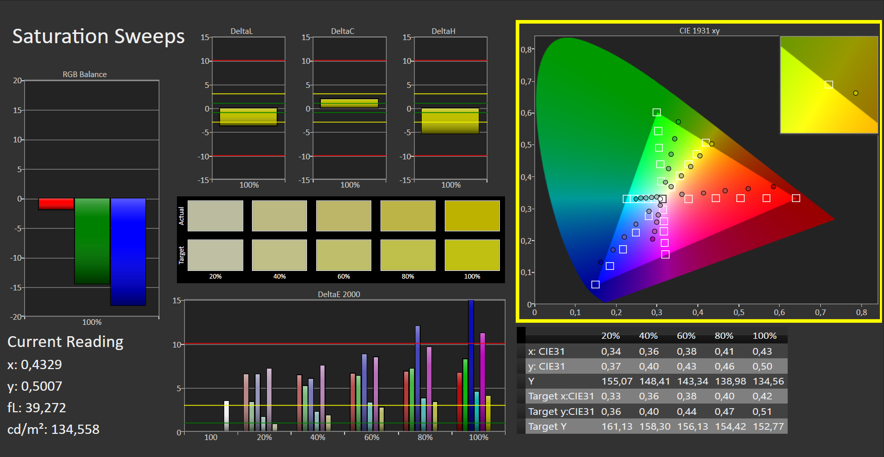 Im Auslieferungszustand zeigt das Display eine akzeptable Farbdarstellung, verfehlt aber das Soll (Delta-E kleiner 3) mit einer Delta-E-2000-Farbabweichung von etwa 6,1. Unter einem Blaustich leidet es nicht. Eine Kalibrierung führt nur zu leichten Verbesserungen. Die Farbräume AdobeRGB (38,1 %) und sRGB (59,1 %) werden nicht vollständig abgebildet.