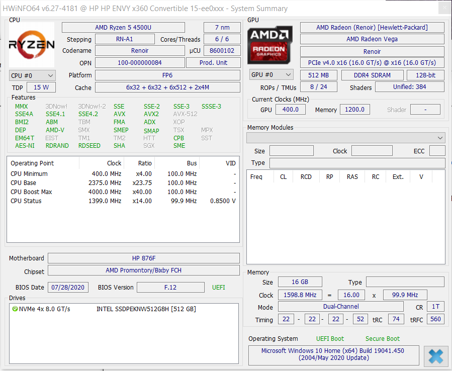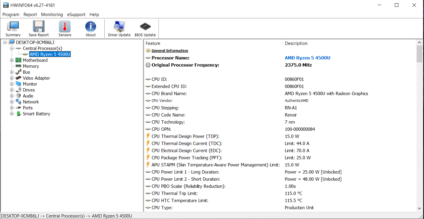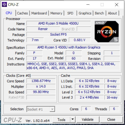 Der CPU-Teil der Ryzen-5-4500U-APU (Renoir) besteht aus einem Sechskernprozessor, der mit Geschwindigkeiten zwischen 2,3 GHz (Basis) und 4 GHz (Turbo) arbeitet. Simultaneous Multithreading (zwei Threads pro Kern) wird nicht unterstützt.