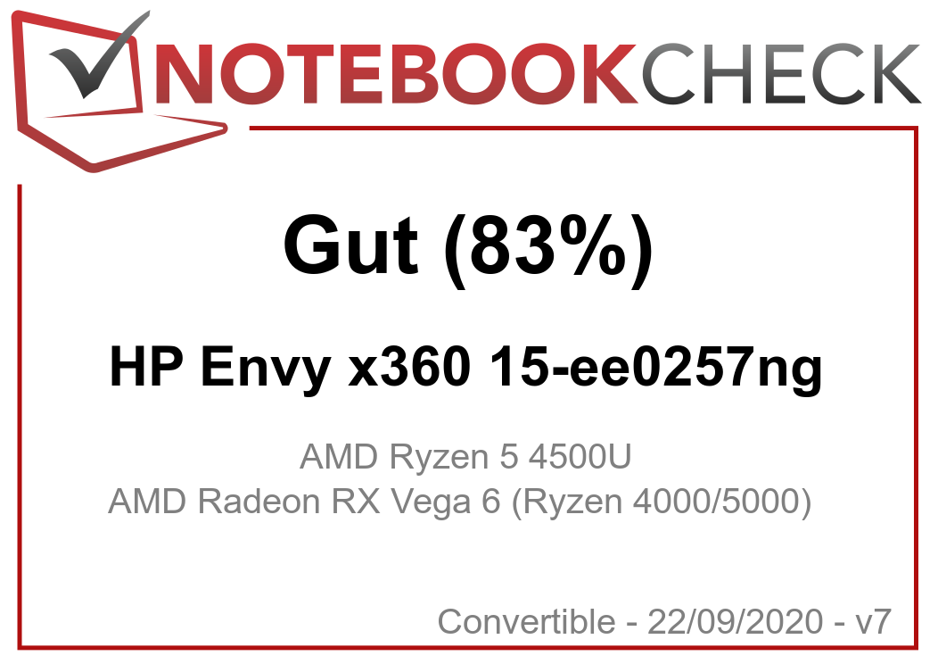 | 82.8 % v7 (old) | 09 / 2020 | HP Envy x360 15-ee0257ng R5 4500U, Vega 6 | 2 kg | 18.9 mm | 15.60" | 1920x1080 | |