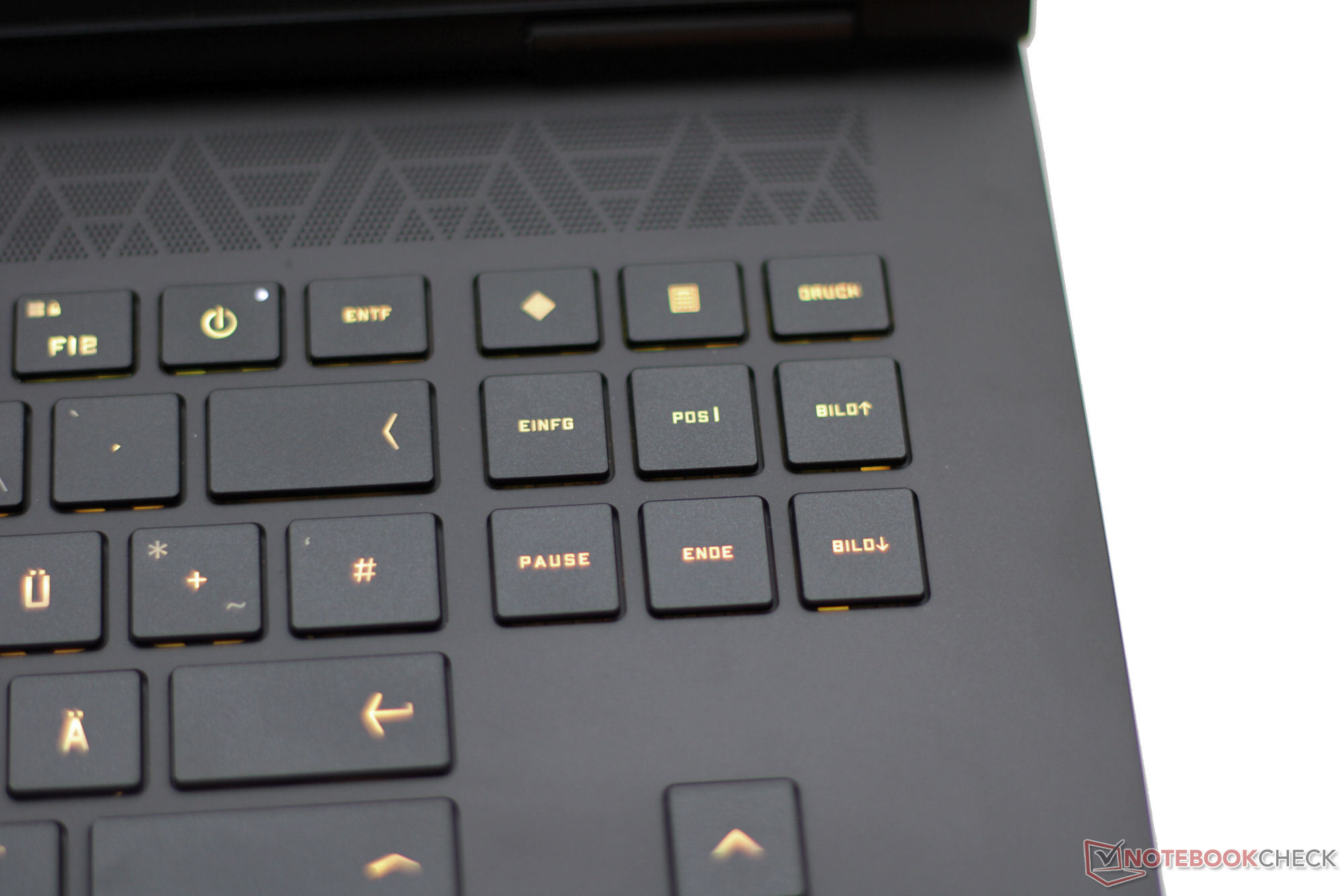 Die beleuchtete Chiclet-Tastatur (RGB) des Omen verzichtet auf einen Nummernblock. Der angedachte Platz wird von Steuertasten sowie den großzügig bemessenen, freiliegenden Pfeiltasten belegt. Die konkaven, leichtgängigen Tasten bieten einen mittleren Hub und einen klaren Druckpunkt. Der Tastenwiderstand geht in Ordnung. Als Mausersatz dient ein Clickpad (ca. 12,5 x 8 cm) mit kurzem Hub und deutlichem Druckpunkt.