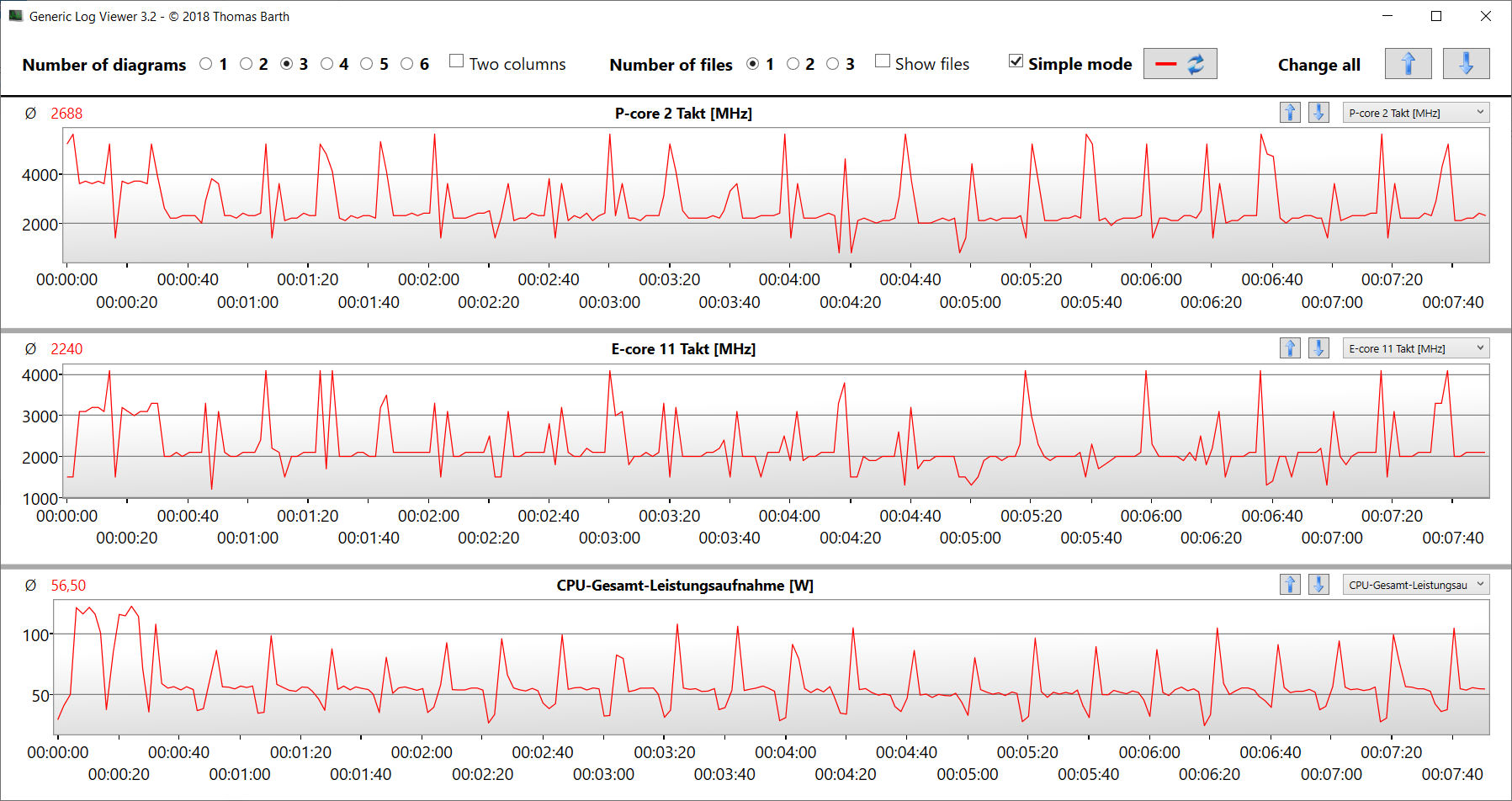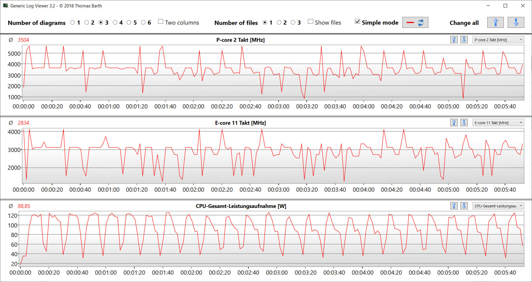 Der Stresstest (Prime95 und Furmark im Dauerbetrieb) stellt ein Extremszenario zur Überprüfung der Systemstabilität unter Volllast dar. Der CPU-Takt sinkt recht schnell von anfänglich 3,4 GHz (P) bzw. 2,9 GHz (E) auf 1,8 bis 1,9 GHz (P, E) und verbleibt auf diesem Niveau. Die GPU geht mit Geschwindigkeiten zwischen 1,9 und 2 GHz zu Werke.