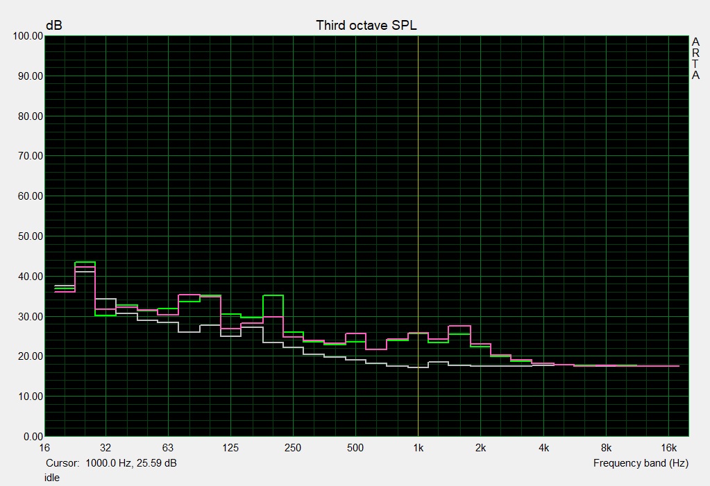 | Idle avg * (dB) | 35 | 30.4 13% | 34 3% | 33 6% | 28.6 18% | 27.6 ? 21% |