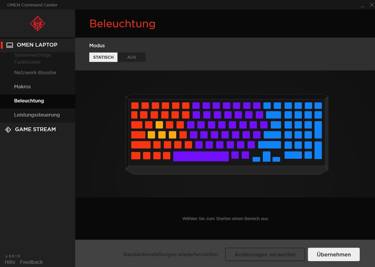 Die Eingabegeräte liefern eine gute Vorstellung ab, können jedoch nicht vollends begeistern. Bei der Tastatur hat sich HP für ein Chiclet-Modell entschieden, das über eine 4-Zonen-Beleuchtung verfügt (letztere ist leider etwas schwach ausgeprägt). Eine Zone stellt dabei den WASD-Bereich dar, dessen Tasten zur besseren Erkennung ohnehin schon mit einer weißen Umrandung versehen sind.