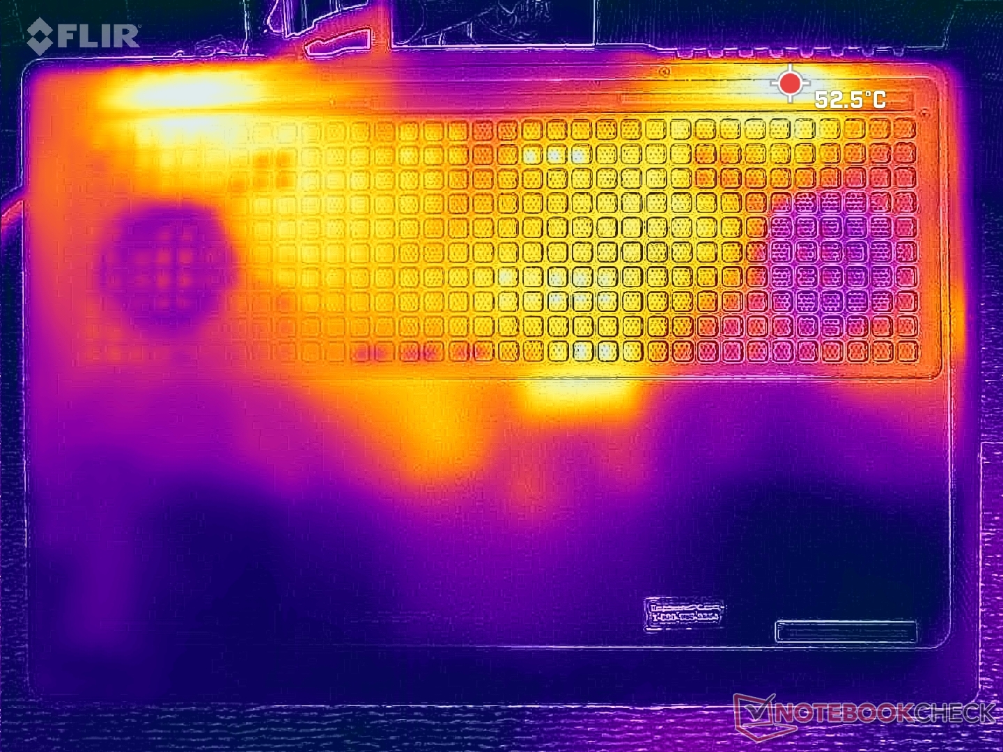 Die Oberflächentemperaturen sind am wärmsten in der Mitte der Tastatur, wo beim Spielen fast 40 °C erreicht werden können. Glücklicherweise bleiben die WASD-Tasten, der Ziffernblock und die Handballenablagen alle viel kühler.