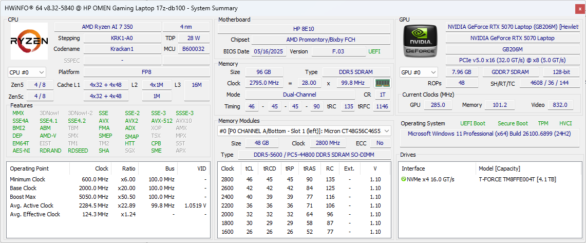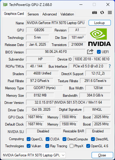 | HP Omen 17z-db100 Ryzen AI 7 350, GeForce RTX 5070 Laptop, TeamGroup T-Force G50 TM8FFE004T, IPS, 2560x1440, 17.3" | HP Omen 17-db0079ng R7 8845HS, GeForce RTX 4070 Laptop GPU, WD PC SN560 SDDPNQE-1T00, IPS, 2560x1440, 17.3" | Lenovo LOQ 17IRX10 i7-14700HX, GeForce RTX 5070 Laptop, WD PC SN7100S SDFPMSL-1T00-1101, IPS, 1920x1080, 17.3" | MSI Crosshair A17 HX D8WGKG R9 8940HX, GeForce RTX 5070 Laptop, Samsung PM9C1 MZVL81T0HELB-00BTW, IPS, 2560x1600, 17" | Asus TUF Gaming A17 FA707XI-NS94 R9 7940HS, GeForce RTX 4070 Laptop GPU, WD PC SN560 SDDPNQE-1T00, IPS, 1920x1080, 17.3" | Acer Nitro 5 AN517-55-5552 i5-12500H, GeForce RTX 4050 Laptop GPU, WDC PC SN810 512GB, IPS, 1920x1080, 17.3" | |