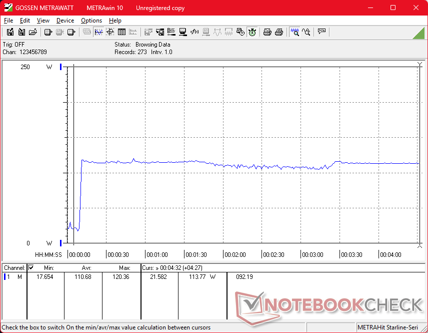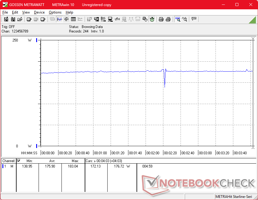 Wir konnten mit dem mittelgroßen (~18 x 8,5 x 2,5 cm) 230-Watt-Netzteil eine maximale Leistungsaufnahme von 228 W aufzeichnen, wenn CPU und GPU zu 100 Prozent ausgelastet sind.