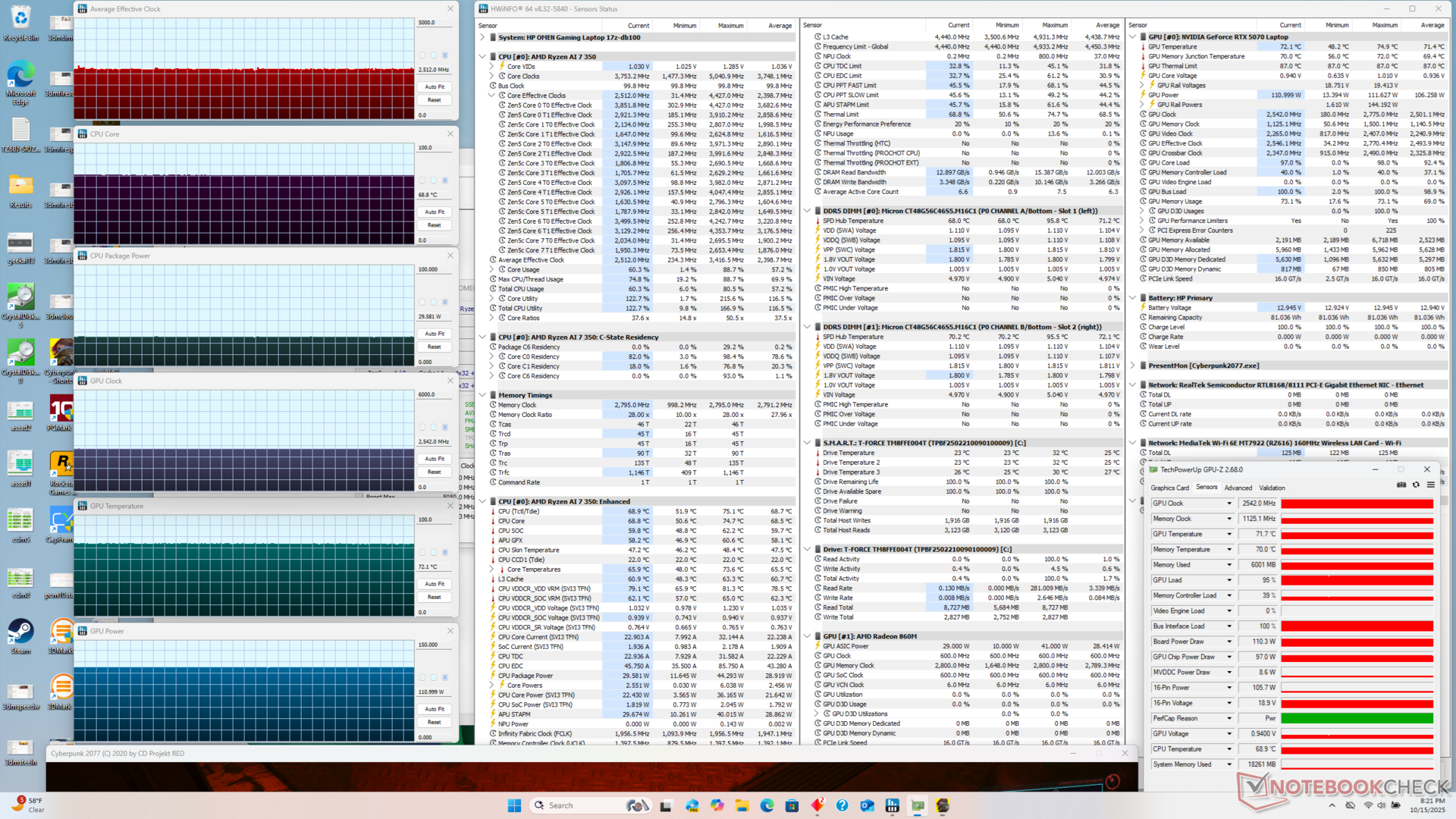| HP Omen 17z-db100 Ryzen AI 7 350, GeForce RTX 5070 Laptop, 83 Wh | HP Omen 17-db0079ng R7 8845HS, GeForce RTX 4070 Laptop GPU, 83 Wh | Lenovo LOQ 17IRX10 i7-14700HX, GeForce RTX 5070 Laptop, 60 Wh | MSI Crosshair A17 HX D8WGKG R9 8940HX, GeForce RTX 5070 Laptop, 90 Wh | Asus TUF Gaming A17 FA707XI-NS94 R9 7940HS, GeForce RTX 4070 Laptop GPU, 90 Wh | Acer Nitro 5 AN517-55-5552 i5-12500H, GeForce RTX 4050 Laptop GPU, 90 Wh | |