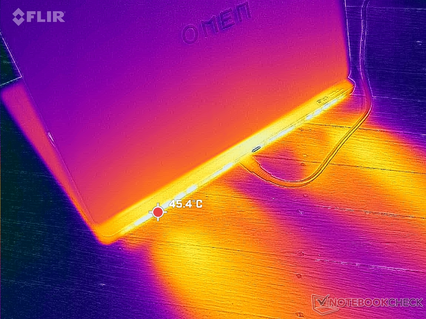Die Oberflächentemperaturen sind am wärmsten in der Mitte der Tastatur, wo Hotspots 40 °C bzw. 35 °C auf der Ober- und Unterseite erreichen können. Die Maximalwerte sind kühler als wir für ein so kleines Gehäuse erwartet hätten, da Alternativen wie das Razer Blade 14 oder Asus Zephyrus G14 auf beiden Seiten im mittleren bis hohen 40 °C Bereich wärmer sein können. Die Handballenablagen fühlen sich beim Spielen nie unangenehm warm an.