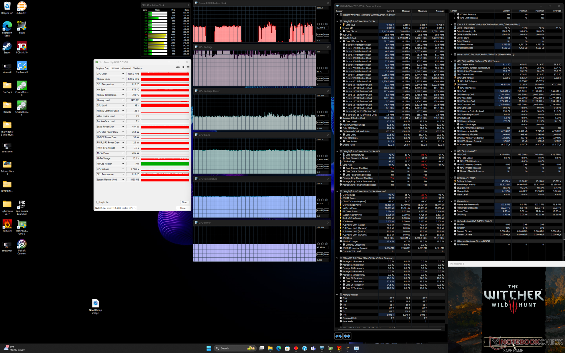 Die Nutzung von Witcher 3 verbraucht etwa 118 W und ist damit vergleichbar mit dem Zephyrus G14, aber immer noch viel niedriger als beim Blade 14. Der Verbrauchsunterschied zwischen unserem Omen Transcend 14 und dem Blade 14 beträgt etwa 60 W, wobei ein Großteil davon auf das höhere TGP-Ziel des schwereren Razer-Systems zurückzuführen ist.