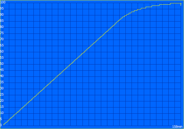 Der 59-Wh-Akku ermöglicht in Verbindung mit den geringen Verbrauchswerten deutlich bessere Akkulaufzeiten als bei der Konkurrenz. Bei einer Helligkeit von 150 cd/m² (entspricht beim Testgerät 80 % der maximalen Helligkeit) ermitteln wir rund 18,5 Stunden und bei voller Helligkeit immer noch mehr als 14 Stunden. Dabei darf man aber nicht vergessen, dass der Bildschirm einfach nicht besonders hell wird. Im Video-Test (ebenfalls 150 cd/m²) sind es sogar fast 22 Stunden. Lediglich bei voller Belastung ist nach rund 1,5 Stunden Schluss. Ein vollständiger Ladevorgang bei eingeschaltetem Gerät dauert 158 Minuten (80 % nach 98 Minuten).