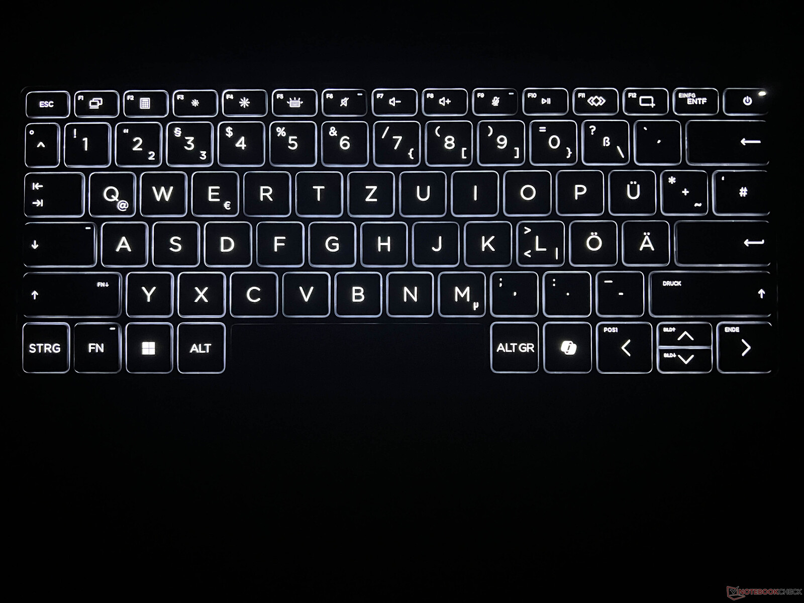 Die beleuchtete Tastatur bietet zwar nur einen recht geringen Hubweg, der Anschlag ist aber präzise und insgesamt ist das Tippgefühl komfortabel. Allerdings sind die Tastenanschläge auch recht laut. Die F-Tasten sind farblich etwas abgesetzt, genauso wie der Power-Button oben rechts. Die vertikalen Pfeiltasten sind klein und es gibt keine dedizierten Tasten für Bild-Auf/Ab, zudem kann die Beleuchtung nicht automatisch aktiviert werden. Das ClickPad funktioniert ohne Probleme und bietet gute Gleiteigenschaften, die mechanischen Klicks im unteren Bereich sind aber recht laut. Der kapazitive Touchscreen steht ebenfalls für Eingaben zur Verfügung.