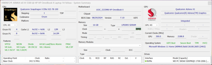 | HP OmniBook X 14 Qualcomm Snapdragon X Elite X1E-78-100 ⎘ Qualcomm SD X Adreno X1-85 3.8 TFLOPS ⎘ 16 GB RAM, 1024 GB SSD | Amazon: 1.299,00 € Bestpreis 1099€ ab-zauberfuchs | 1.3 kg | 14.3 mm | 14.00" 2240x1400 189 PPI IPS | |