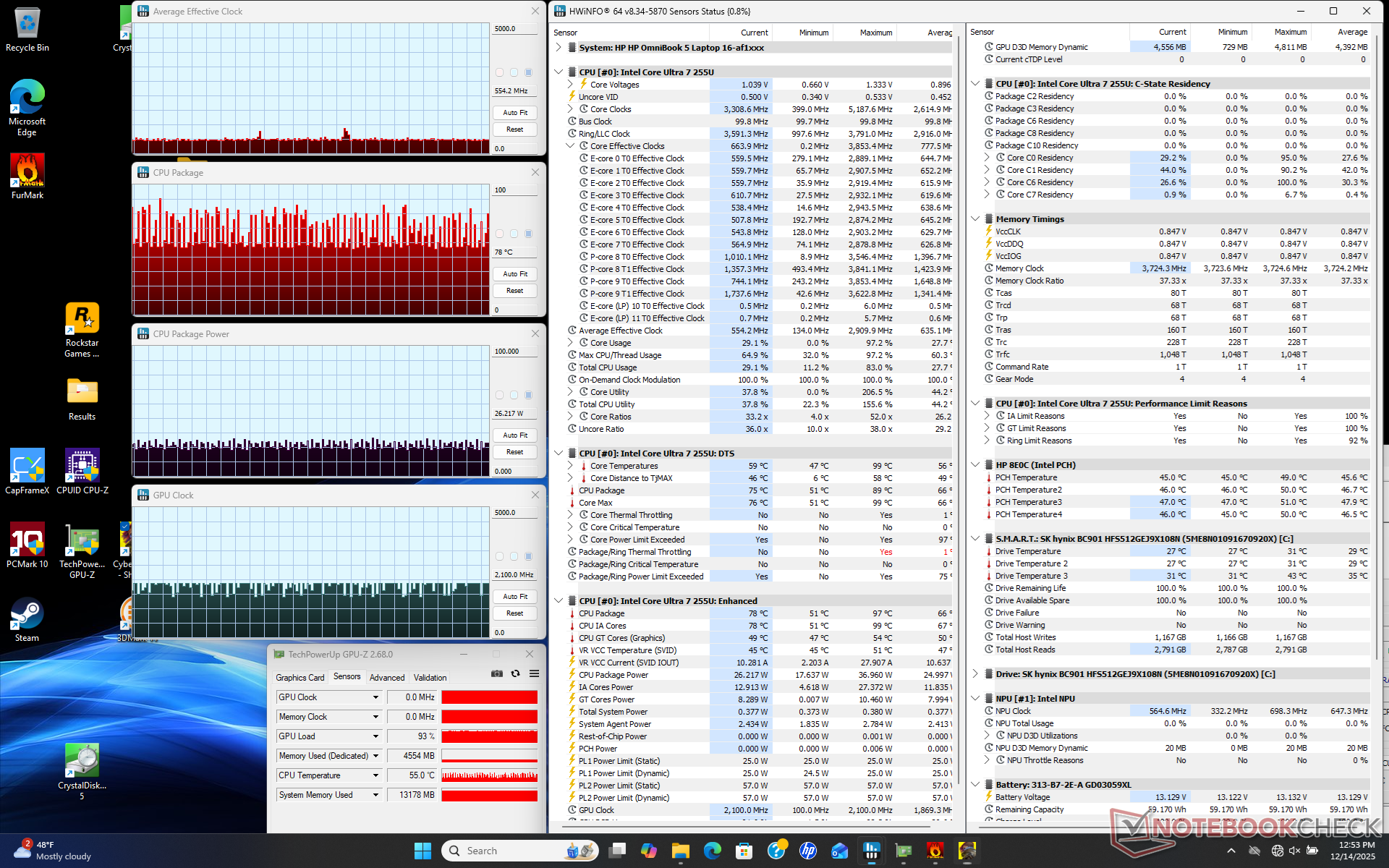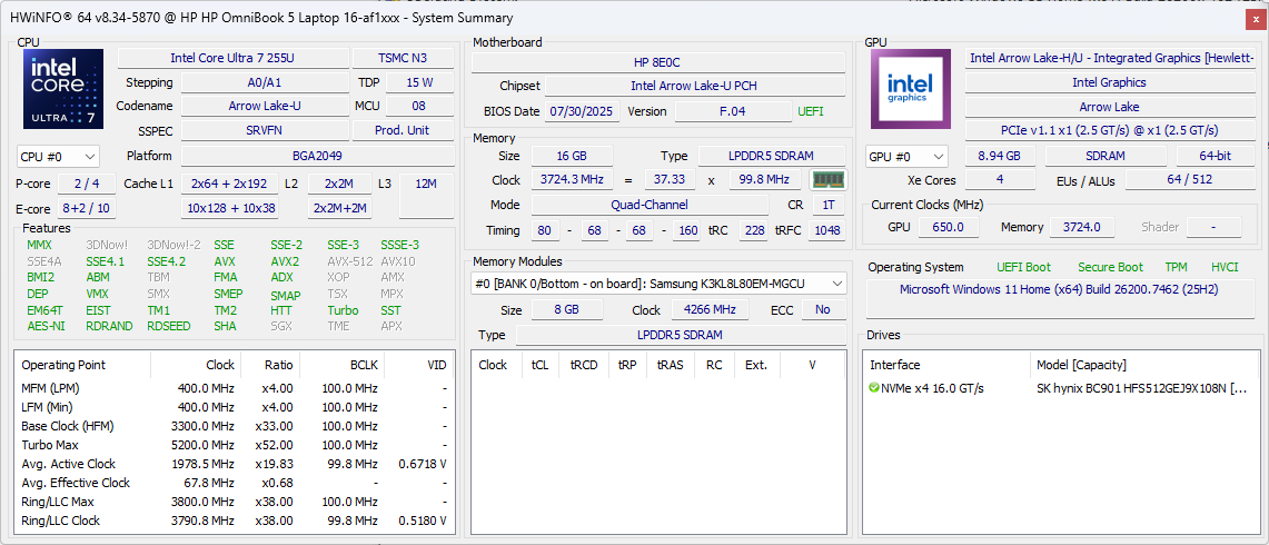 | HP Omnibook 5 16-af1037nr Intel Core Ultra 7 255U ⎘ Intel Graphics 4-Core iGPU (Meteor / Arrow Lake) ⎘ 16 GB RAM | Amazon: Listenpreis: 660 USD | 1.7 kg | 18.6 mm | 16.00" 1920x1200 142 PPI IPS | |