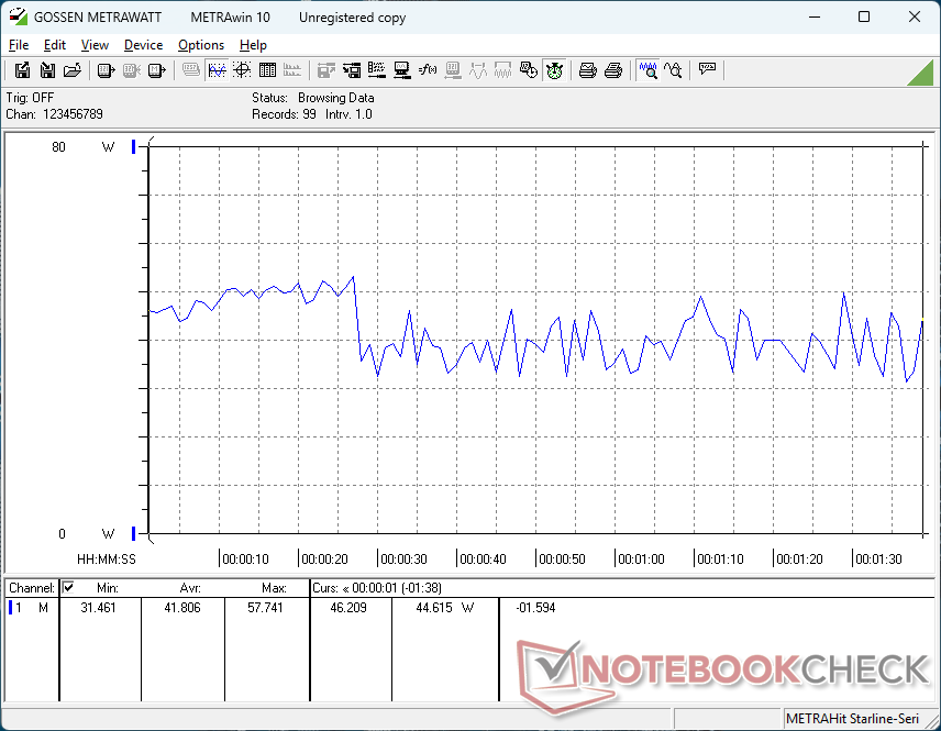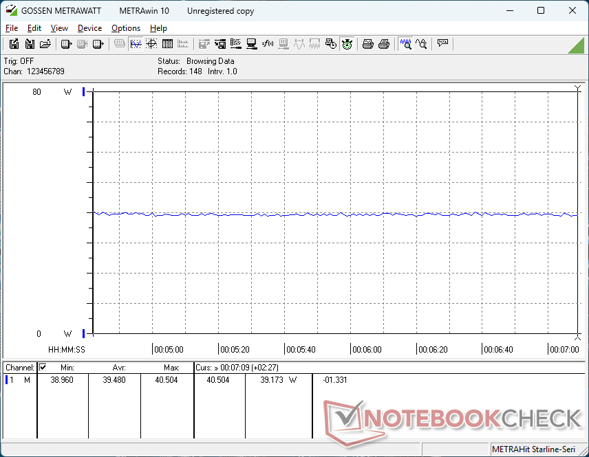 Der Gesamtverbrauch entspricht in etwa dem, den wir mit dem Lunar-Lake V-betriebenen Dell 16 Plus aufgezeichnet haben und bietet eine ähnliche CPU-Leistung, aber eine deutlich langsamere Grafikleistung. Das kleine 65-W-USB-C-Netzteil ist ausreichend für die Leistung und den Strombedarf.