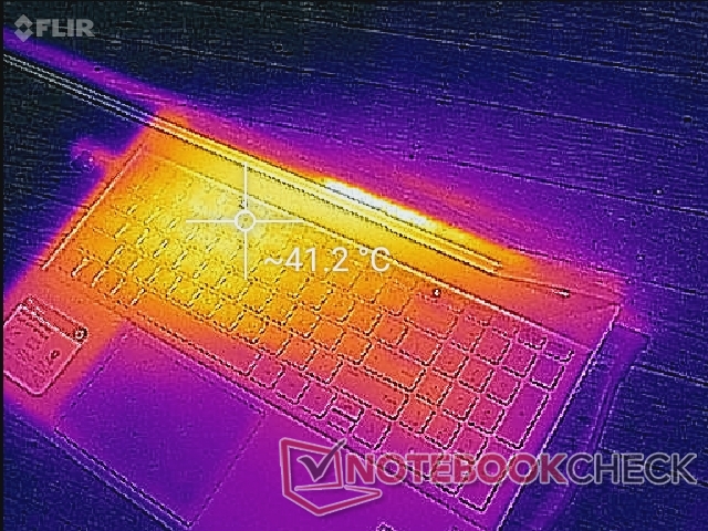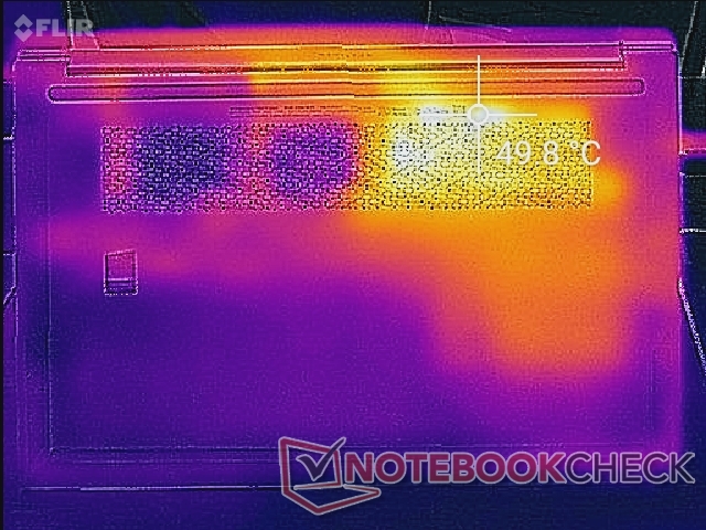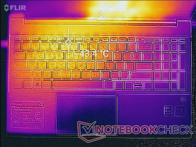 Die Oberflächentemperaturen werden auf der linken Hälfte des Systems immer wärmer sein als auf der rechten Hälfte, einfach aufgrund der Positionierung der Lüfter und Heatpipes im Inneren. Hot Spots können bis zu 44 bzw. 54 °C auf dem Tastaturdeck und der Unterseite warm werden, was etwas wärmer ist als das, was wir beim Pavilion 15 Gaming oder ADATA XPG Xenia messen. Die Gesamtwärmeabgabe ist generell höher als bei den meisten Laptops, die nur mit Tiger-Lake-U-CPUs laufen, da unser Pavilion über eine diskreten Grafikprozessor verfügt.