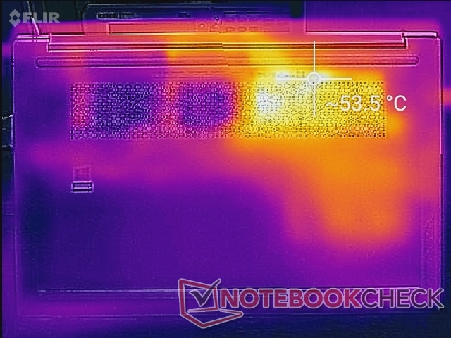 (-) Auf der Unterseite messen wir eine maximalen Wert von 53.4 °C (im Vergleich zum Durchschnitt von 39.2 °C).