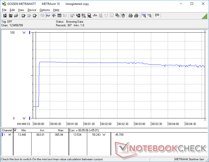 Der Leerlauf auf dem Desktop bei niedrigster Helligkeitseinstellung verbraucht nur 4,9 W, während die maximale Helligkeitseinstellung etwa 3 W mehr verlangt. Die Aktivierung der diskreten Nvidia GPU über Optimus würde die Systemaufnahme auf 14 W erhöhen und damit auf einige Watt mehr als andere Tiger-Lake-U-Laptops ohne die gleiche GPU-Option kommen. Es wird empfohlen, die integrierte Intel GPU zu verwenden, wenn die zusätzliche Leistung der MX450 nicht benötigt wird.