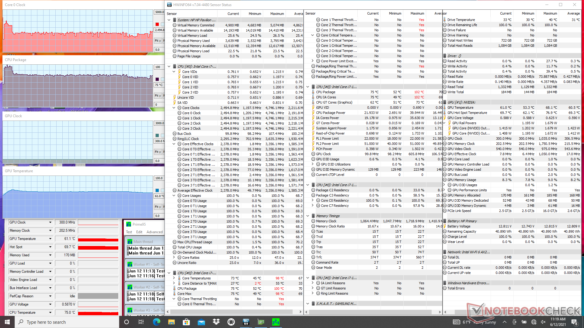 Wenn wir Prime95 laufen lassen, um die CPU zu belasten, steigen die Taktraten für die ersten 20 Sekunden oder so in den Bereich von 3,2 bis 3,7 GHz bei einer warmen Kerntemperatur von 96 °C. Danach sinkt die Taktrate in den Bereich von 2,0 bis 2,5 GHz, um eine kühlere Kerntemperatur von 75 °C beizubehalten. Das ADATA XPG Xenia, das mit der gleichen Core-i7-1165G7-CPU ausgestattet ist, würde sich bei höheren Taktraten und Temperaturen von 3,2 GHz bzw. 81 °C stabilisieren. Das CPU-Turbo-Boost-Potenzial ist also eingeschränkter, als es uns bei unserem HP Pavilion gefällt.