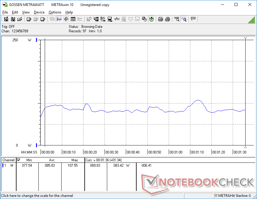 In der Spitze konnten wir einen Bedarf von 182 W messen, die durch das mittelgroße (16,5 x 8 x 2,5 cm) 200-W-Netzteil gezogen wurden. Der Energiebedarf bleibt allerdings nicht allzu lange auf diesem hohen Niveau sondern sinkt sehr schnell auf deutlich niedrigere 123 W ab, wie den Graphen unten entnommen werden kann. Die Taktraten von CPU und GPU sinken analog dazu.