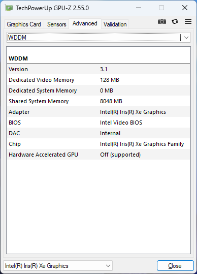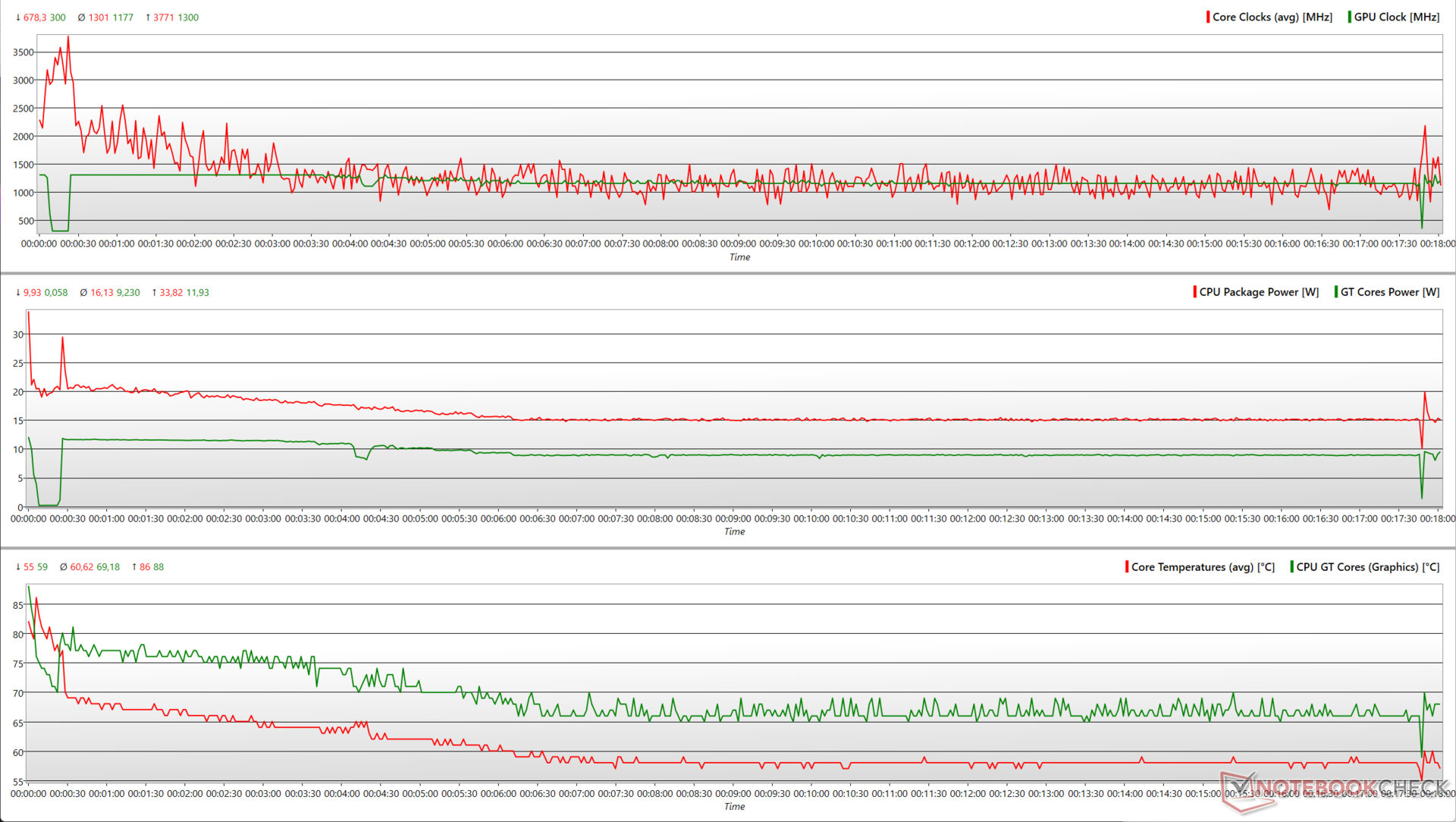 Die integrierte Iris Xe Graphics konnte beim Hinzufügen von FurMark kurzzeitig 20,3 W verbrauchen und auf bis zu 1.300 MHz hochtakten, aber sie konnte insgesamt nicht mehr als 4 W verbrauchen. Die iGPU konnte jedoch 9,23 W verbrauchen und auf durchschnittlich 1.177 MHz hochtakten, während sie mit The Witcher 3 bei 1080p Ultra belastet wurde.