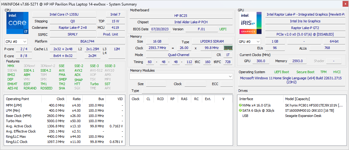 Die aktuelle Konfiguration des HP Pavilion Plus 14 basiert auf dem Intel Core i7-1355U und verfügt über 16 GB LPDDR5x-Speicher sowie 1 TB PCIe NVMe-Speicher.