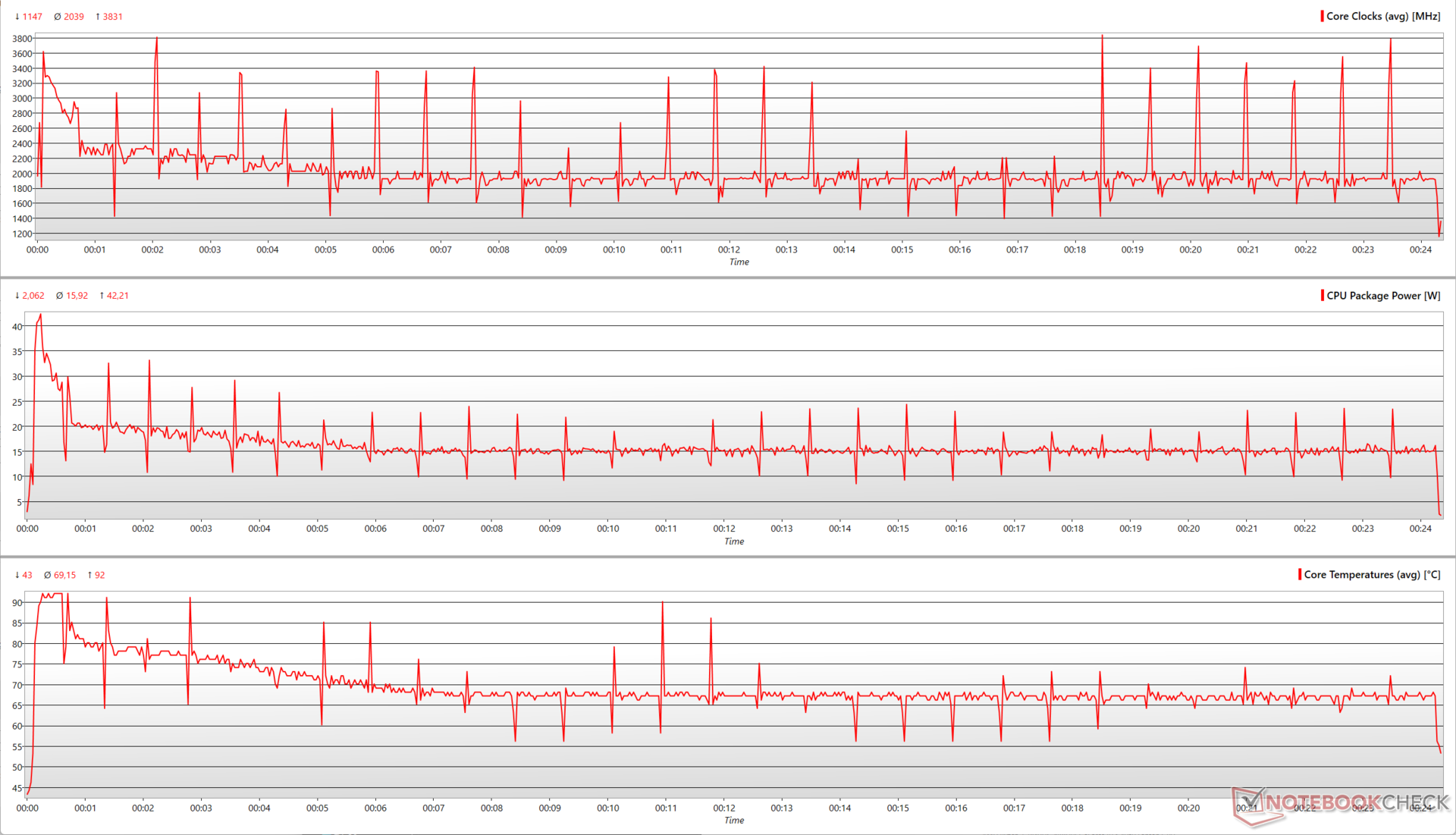 Das Notebook konnte während des Stresstests nur kurzzeitig das maximale PL2 nutzen und die CPU und iGPU entsprechend hochfahren.