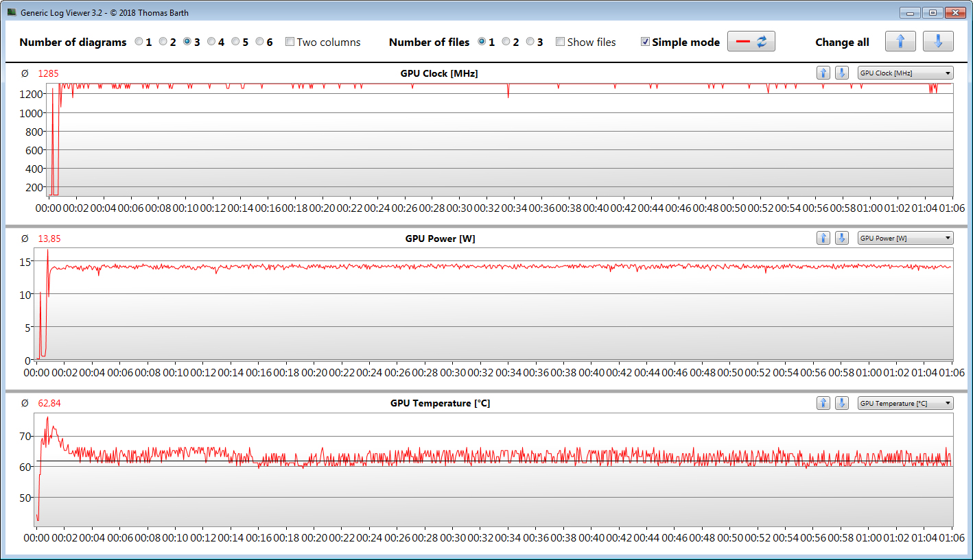 Im Leerlauf registrieren wir eine maximale Leistungsaufnahme von 10,4 Watt. Der Stresstest (Prime95 und Furmark laufen für mindestens eine Stunde) lässt den Bedarf auf bis zu 34,6 Watt steigen - ein sehr niedriger Wert für die hier verbaute CPU. Hier macht sich die starke Drosselung von CPU und GPU während des Stresstests bemerkbar. Das folgende Diagramm verdeutlicht die konstante Leistungsaufnahme während des Witcher-3-Tests. Die Nennleistung des Netzteils beträgt 45 Watt.