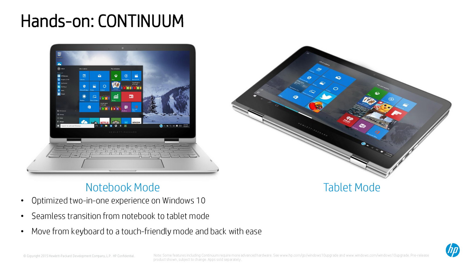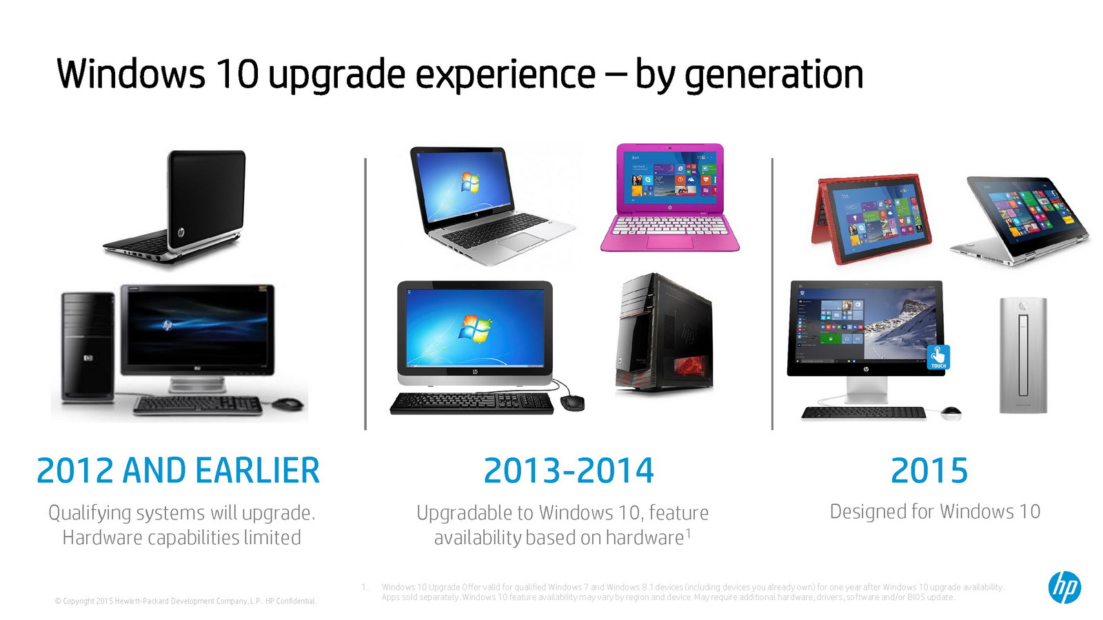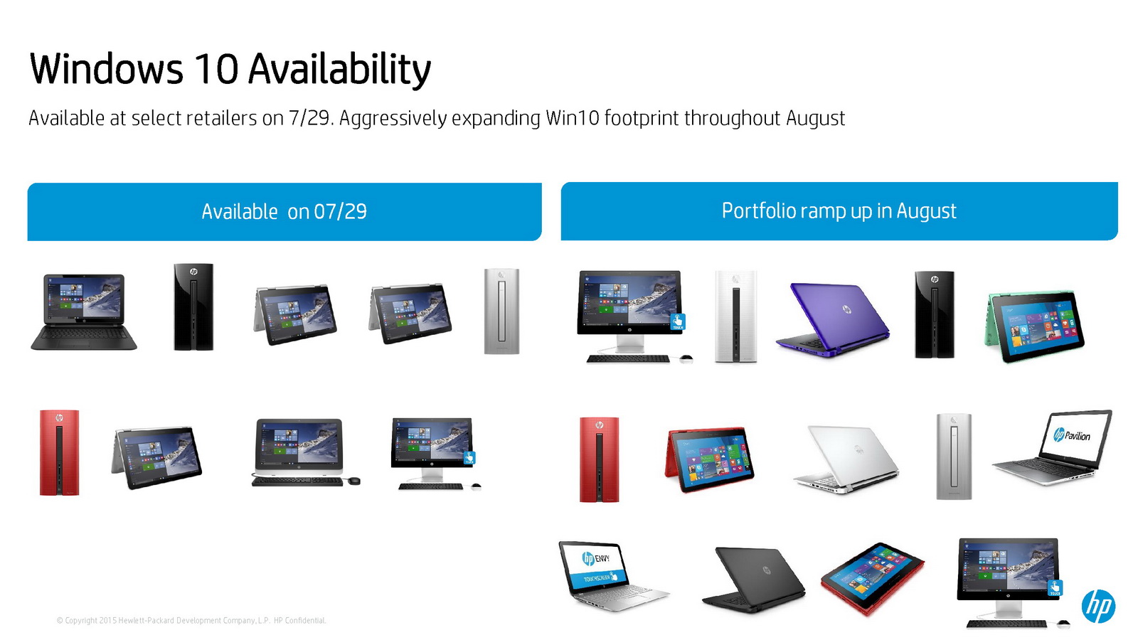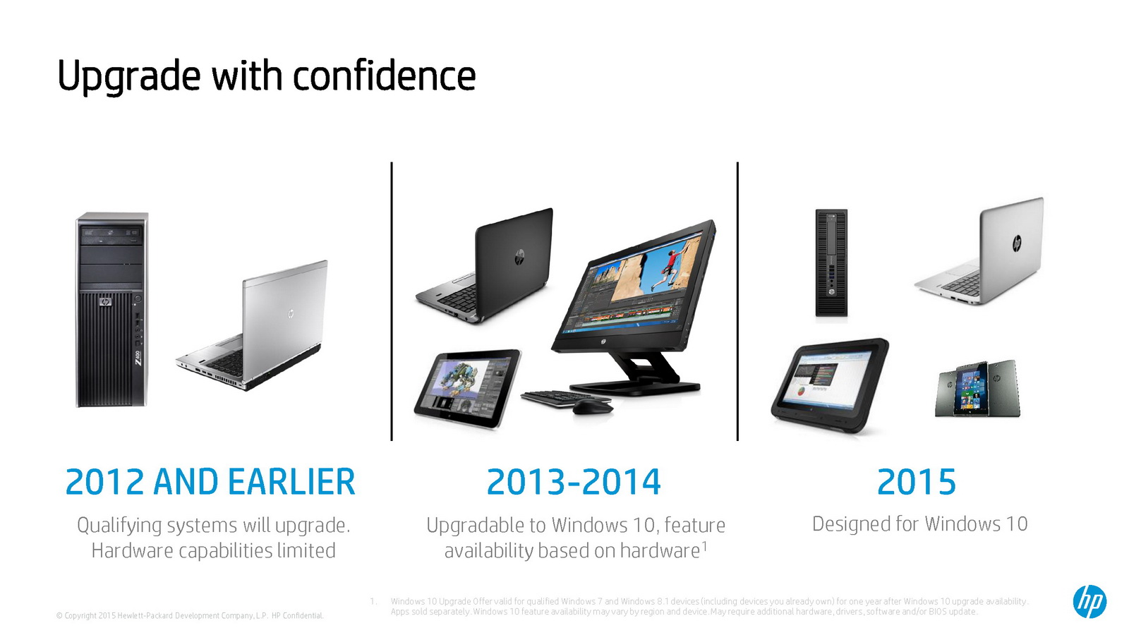 Die Upgrade-Möglichkeit auf Windows 10 hatte HP bereits im Entwicklungsprozess der PCs für 2015 eingeplant. Neue Produkte werden mit Verfügbarkeit von Windows 10 bereits mit dem neuen OS ausgeliefert. PCs von HP, die derzeit mit Windows 7 und Windows 8.1 ausgestattet sind, werden voraussichtlich ebenfalls auf Windows 10 aktualisiert.