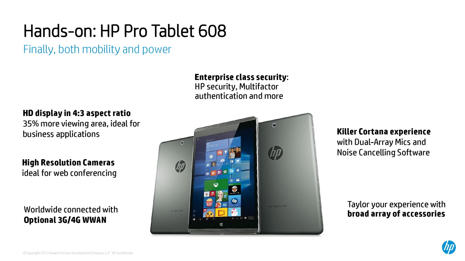 Auch das rund 420 Gramm schwere 7,9-Zoll-Tablet HP Pro Tablet 608 G1 mit Intel Atom x5-Z8500 der Cherry-Trail-Generation (14 nm) ist fit für Windows 10 und wird ab August mit dem neuen Windows-OS geliefert. Aber auch der Umstieg von Windows 8.1 respektive Windows 8.1 Pro bei dem bereits verfügbaren Modell stellt das universelle Tablet für den professionellen Einsatz vor keine Schwierigkeiten. Das Tablet verfügt neben einem USB Typ-C Port (USB 3.0) über eine Auflösung von 2048 x 1536 Pixeln, je nach Modell bis zu 4 GB RAM, bis zu 128 GB eMMC, schnelles WLAN 802.11 ac, Bluetooth 4.0 + LE und optional auch über eine LTE-Unterstützung.
