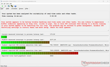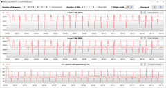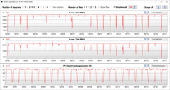 Der Stresstest (Prime95 und Furmark im Dauerbetrieb) stellt ein Extremszenario zur Überprüfung der Systemstabilität unter Volllast dar. CPU (P: 2,5 GHz, E: 1,9 GHz) und GPU (832 MHz) beginnen den Test mit recht niedrigen Taktraten. Im weiteren Verlaufen sacken die Werte in den Keller ab.