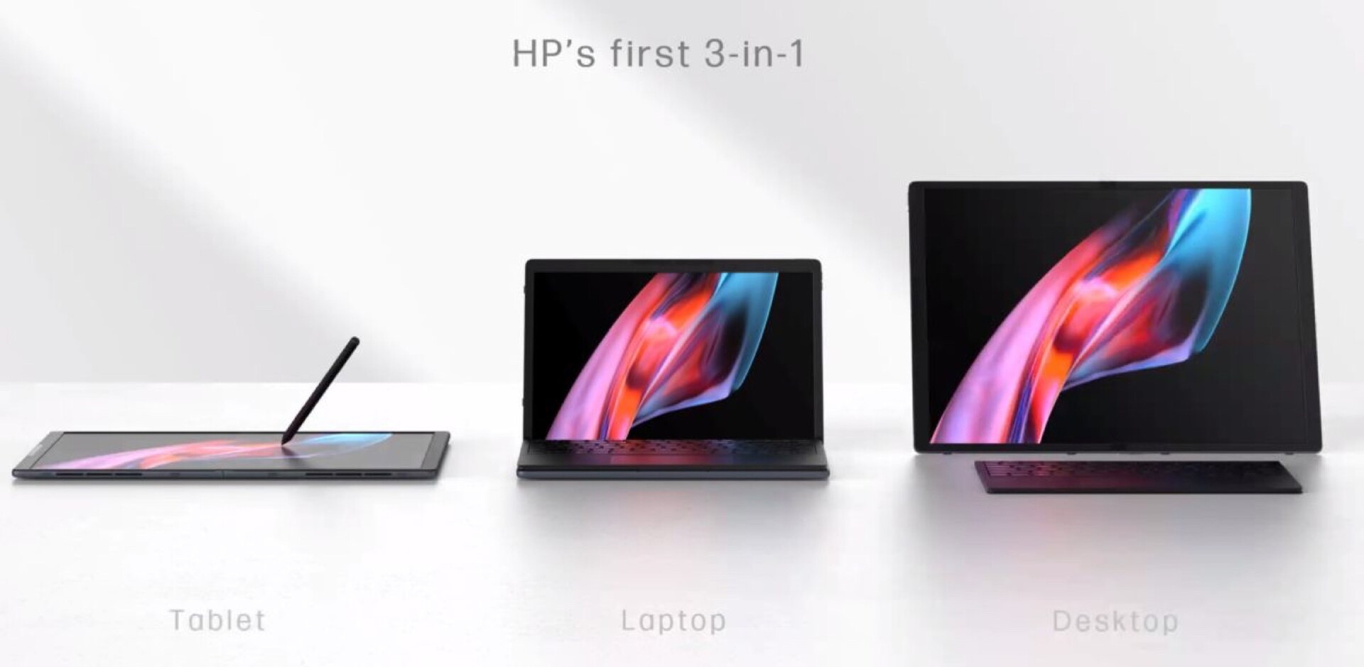 Alternativ kann das Gerät wie ein Laptop aufgeklappt werden. In diesem Fall wird die Tastatur mit integriertem Trackpad auf der unteren Hälfte platziert, die obere Hälfte fungiert als 12,3 Zoll Display. HP liefert einen Stylus mit, der auf der Rückseite des Gehäuses verstaut werden kann. Die Tastatur wird drahtlos geladen, wenn diese auf dem Display platziert wird. HP verbaut einen dedizierten KI-Chip, der unter anderem Kamera-Effekte und das automatische Sperren und Entsperren des Laptops ermöglicht, wenn sich der Nutzer vom Gerät entfernt oder sich dem Notebook nähert.