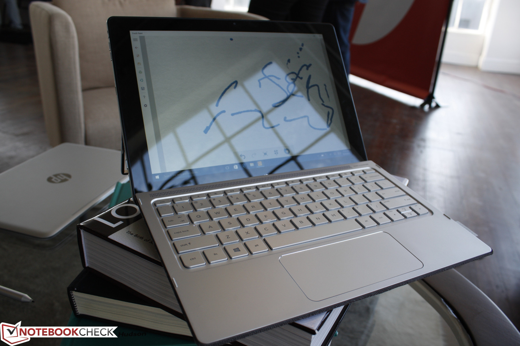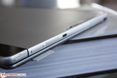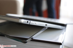 Das Highlight ist der 3,5 mm dicke Kickstand für das Convertible. Die U-förmige Konstruktion erscheint auf den ersten Blick vielleicht etwas schwach, aber der Bügel aus Edelstahl hinterlässt im Erstkontakt bis zu seinem maximalen Öffnungswinkel von ~175 Grad einen sehr stabilen Eindruck. HP hat uns verraten, dass auch ein rechteckiger Stand wie beim Surface Pro 3 in Betracht gezogen wurde, aber das U-förmige Design ermöglicht einen größeren Akku in einem dünneren Gehäuse.