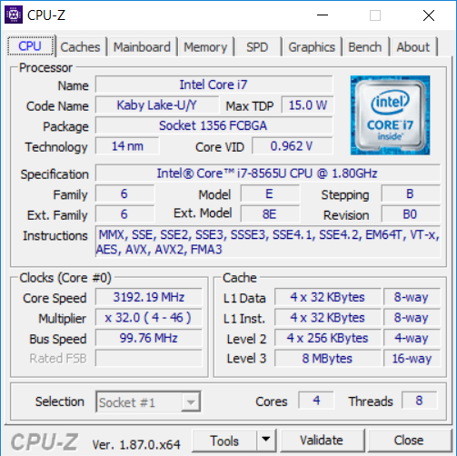 HP verbaut einen schnellen Core-i7-ULV-Prozessor von Intel, dessen vier Kerne für alltägliche Aufgaben mehr als genug Leistung bieten. Allerdings ist die Kühlung des HP Spectre x360 13 nicht in der Lage, das volle Potenzial des Chips auszunutzen. Bei der Belastung von einem Kern sehen wir 4,0-4,1 GHz, bei allen vier Kernen maximal 2,9 GHz. Auf dem Datenblatt macht sich der i7 natürlich gut, in der Praxis sind viele andere Laptops mit einem Core i5 allerdings schneller. Fairerweise muss man jedoch anmerken, dass die direkte Konkurrenz auch nicht viel besser dasteht. Im Akkubetrieb ist die Leistung nicht reduziert. Weitere technische Informationen zum Core i7-8565U gibt es hier.