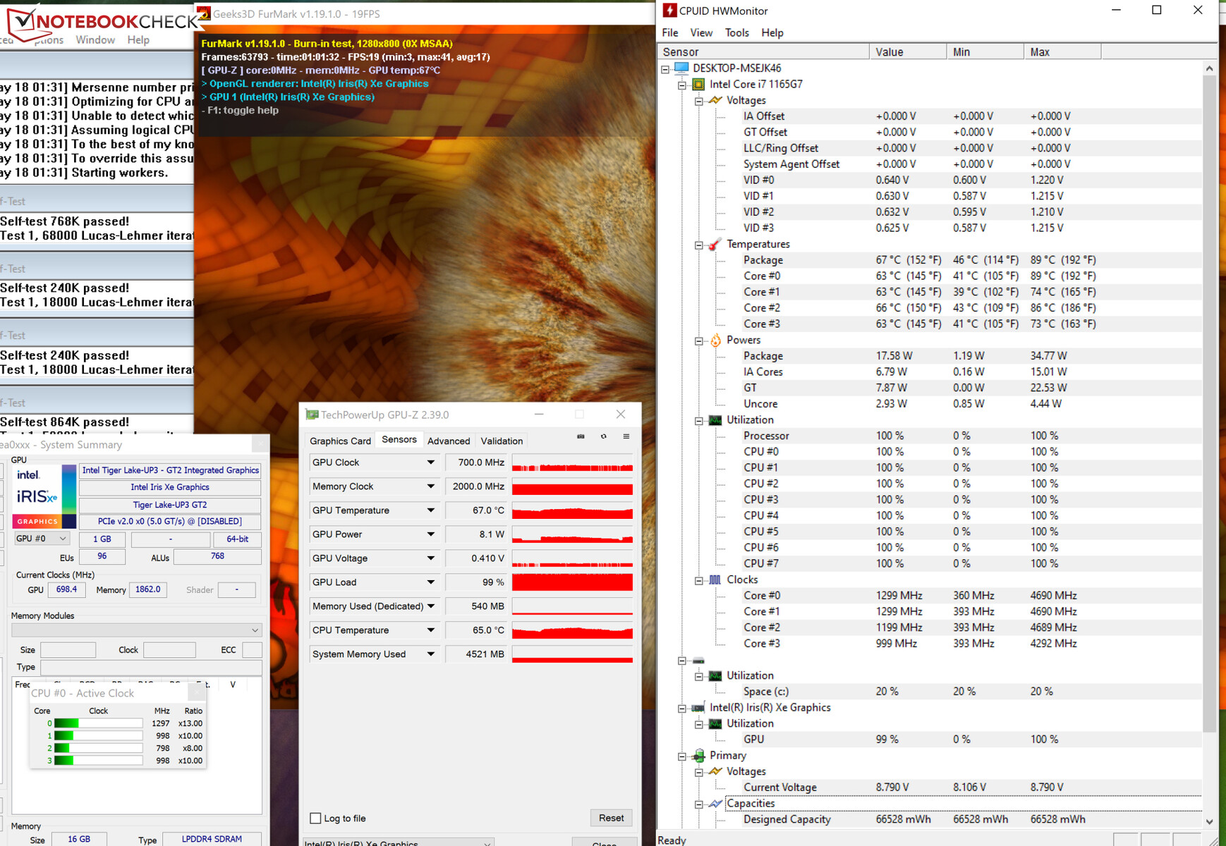 Unseren Stresstest (Prime95 und Furmark laufen für mindestens eine Stunde) bearbeiten CPU bzw. GPU mit 800 bis 1.300 MHz bzw. 700 MHz. Der Stresstest stellt ein Extremszenario dar. Wir überprüfen mit diesem Test, ob das System auch bei voller Auslastung stabil läuft.