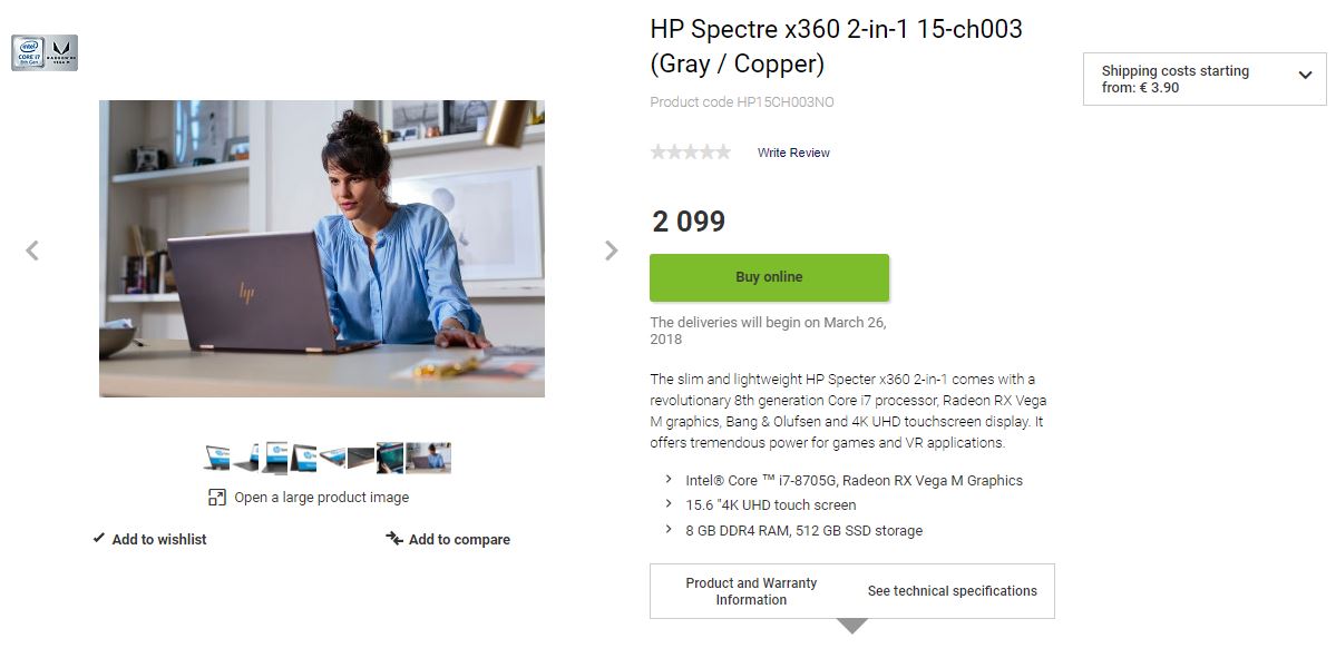 Während das zur CES ebenfalls neu vorgestellte HP Spectre x360 mit Core i7-8550U-CPU und Nvidia MX150-Grafik bereits auf der HP Homepage zu finden ist, macht sich das spannendere Modell mit der neuen Intel Kaby Lake-G CPU/GPU-Familie offiziell noch rar. In Finnland wurde diese Kombination nun aber von einem treuen Notebookcheck-Leser beim Online-Händler Gigantti entdeckt. (Danke für den Tipp!)